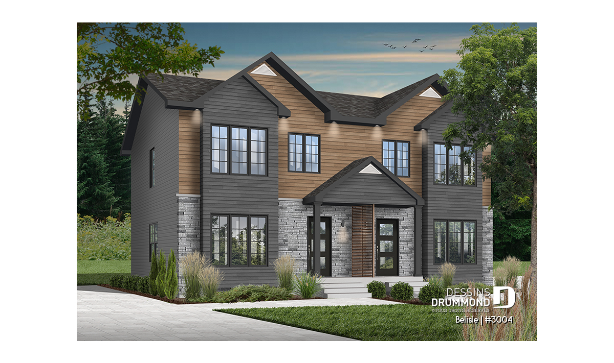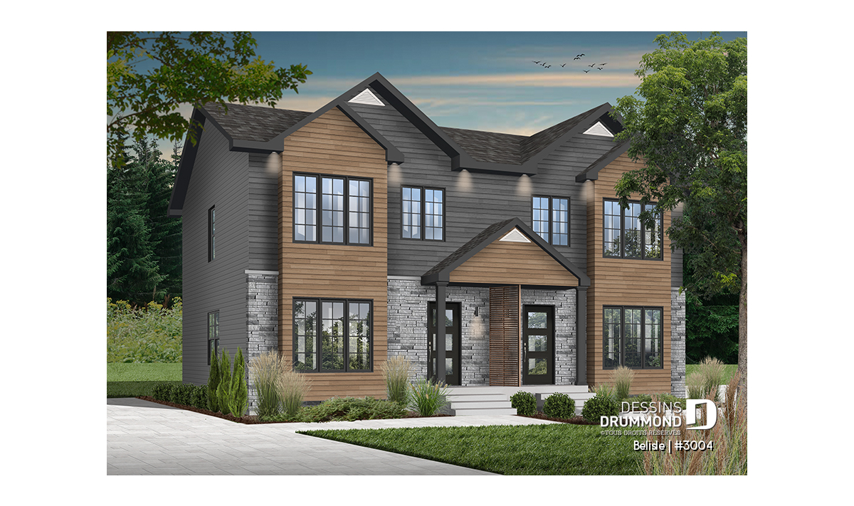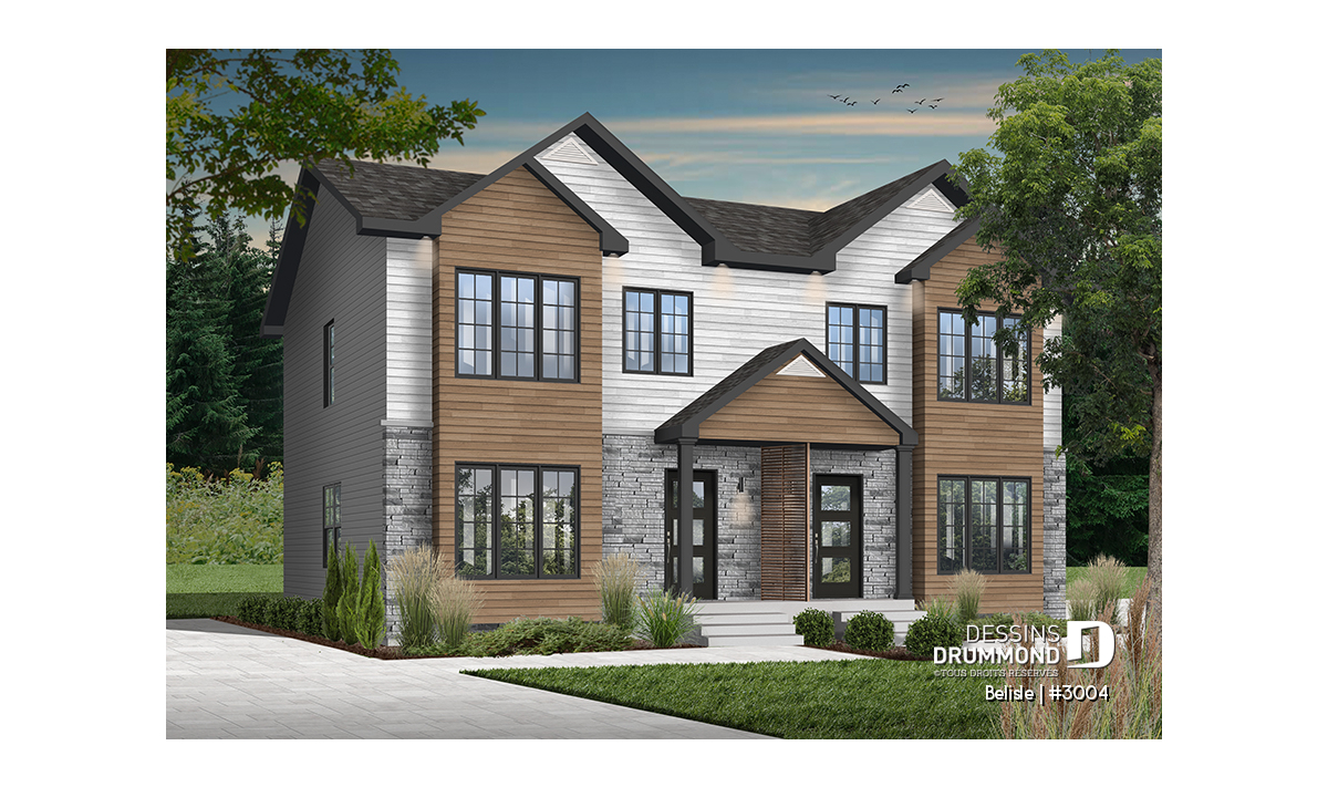 Magnifique plan de maison jumelé à étage, style moderne, 3+ chambres et 2.5 salles de bain par unité.