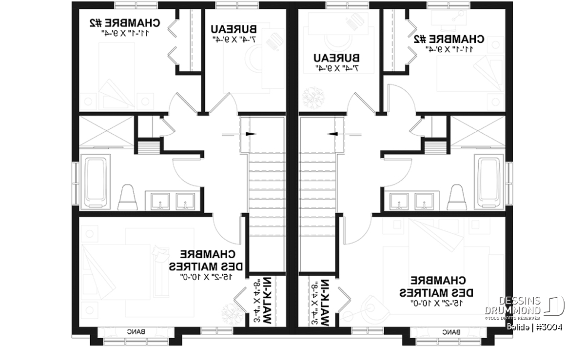 Plan de maison jumelé, aménagé sur 3 étages, 3 chambres, 2.5 sdb par unité