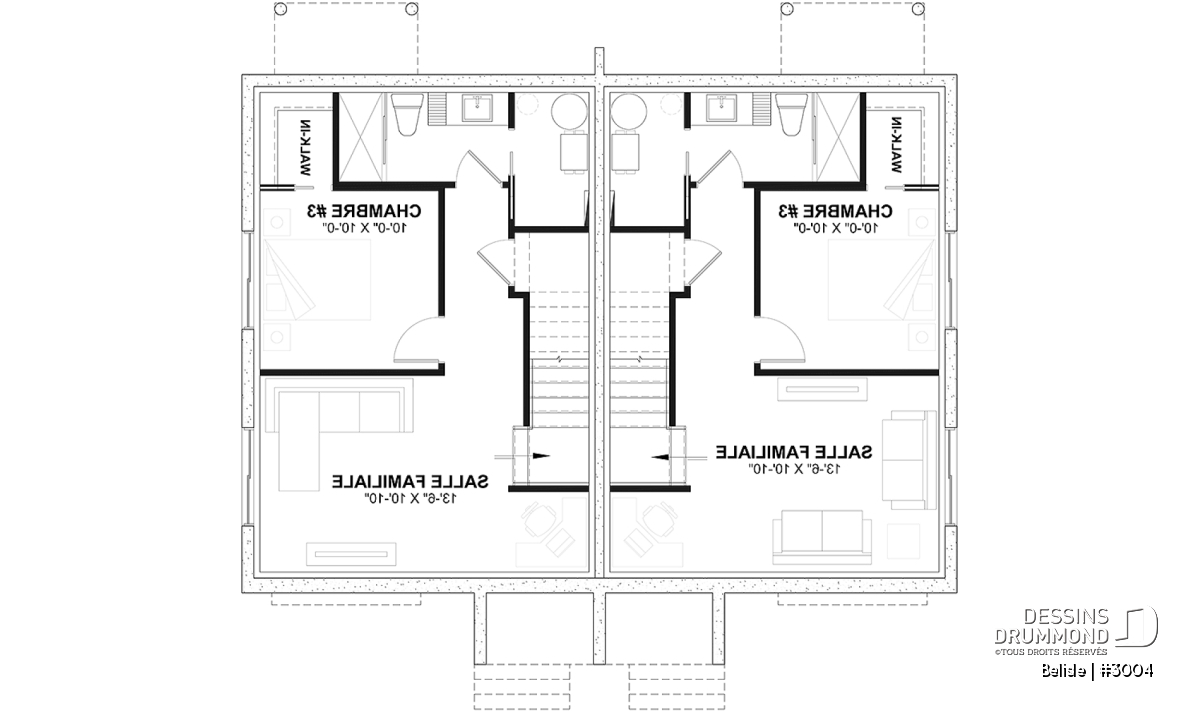 Étage - Plan de maison jumelé, aménagé sur 3 étages, 3 chambres, 2.5 sdb par unité - Belisle