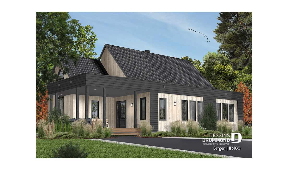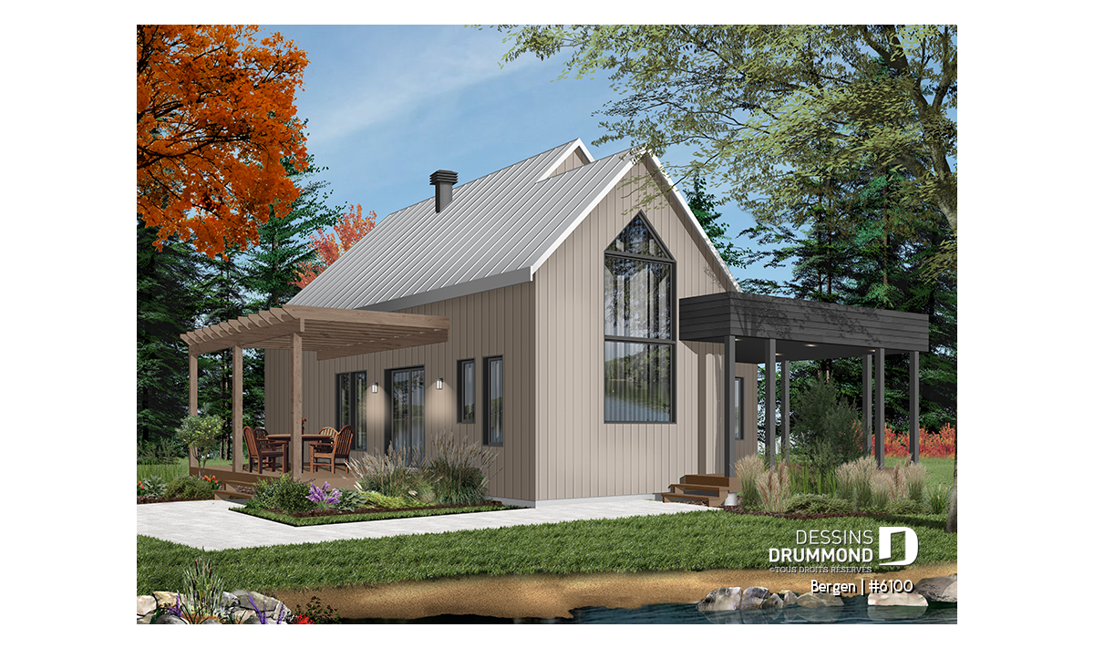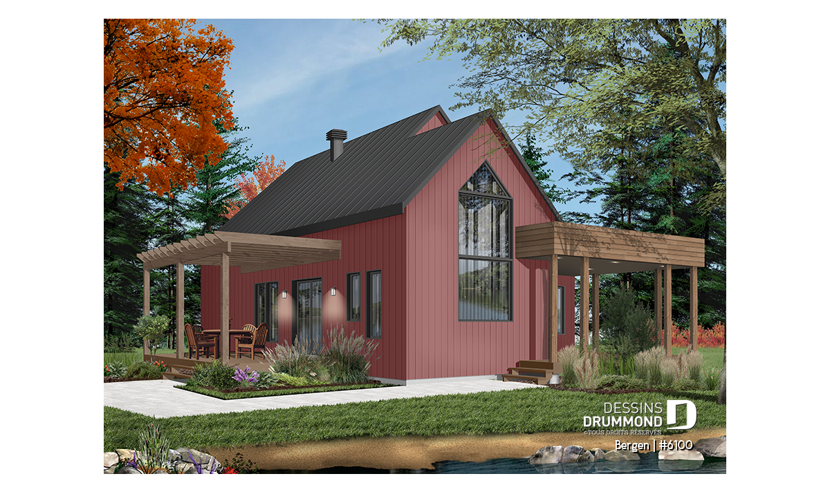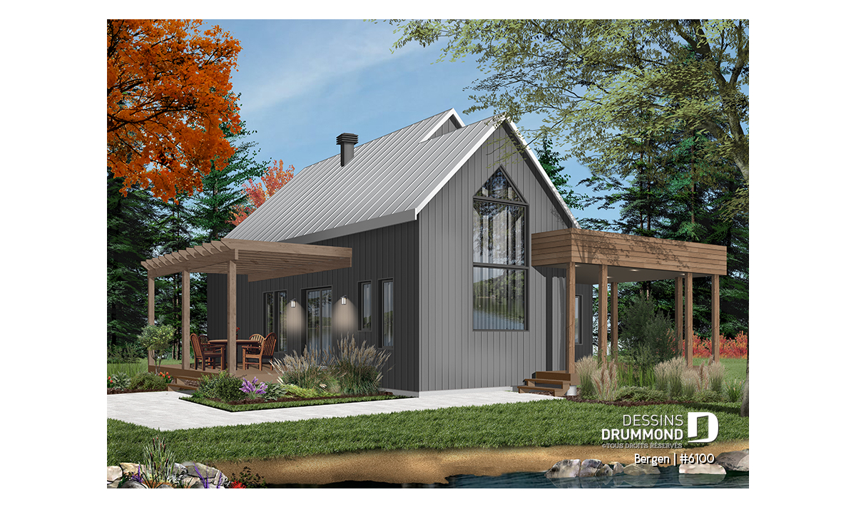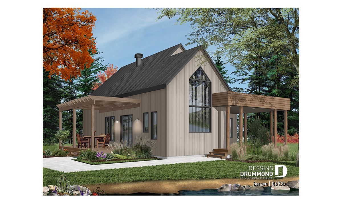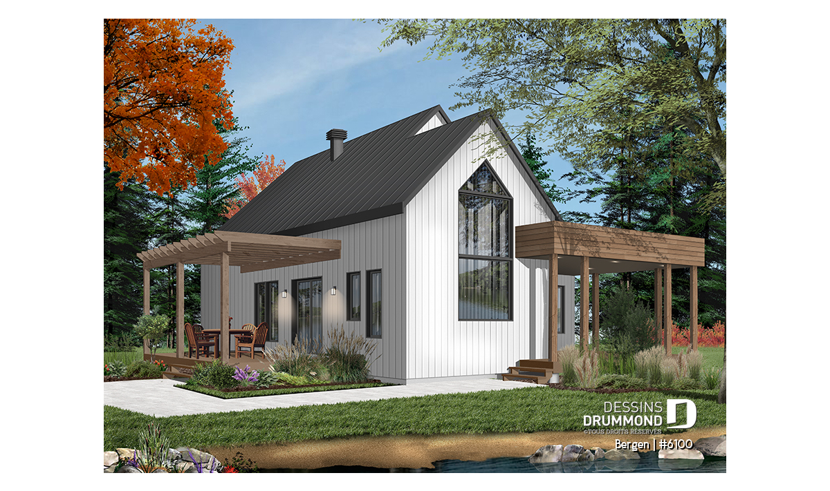 Superbe nouveau plan de maison (ou plan de chalet) de style moderne no. 6100 (aussi nommé Bergen), fortement inspiré des modèles de maison de style Scandinave. L’architecture originale de ce modèle propose plusieurs éléments des plus appréciables tels que beaucoup de lumière naturelle en façade, à l’arrière et surtout dans le secteur cuisine où une énorme fenêtre y est aménagée, au-dessus de l’évier. De plus, le grand balcon avant est couvert, et la terrasse arrière pourra aisément recevoir une pergola afin de laisser entrer la lumière au secteur salon et salle à manger. *le coût de la pergola et du toit de tôle ne sont pas inclus dans notre prix approx.