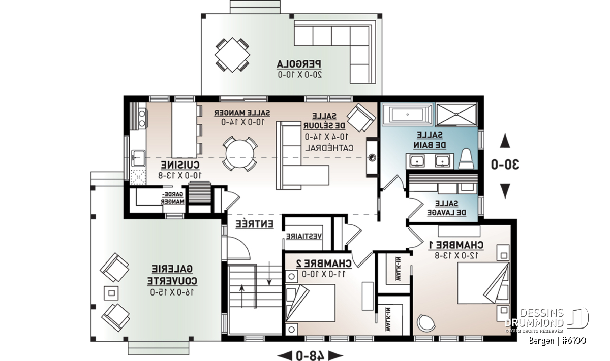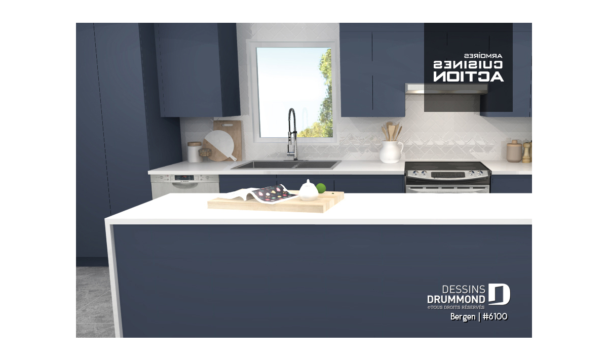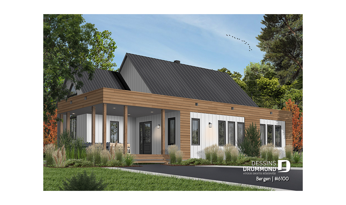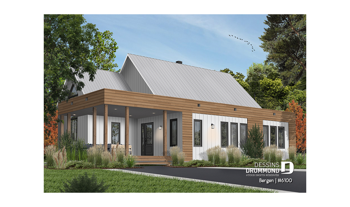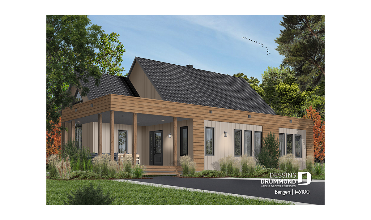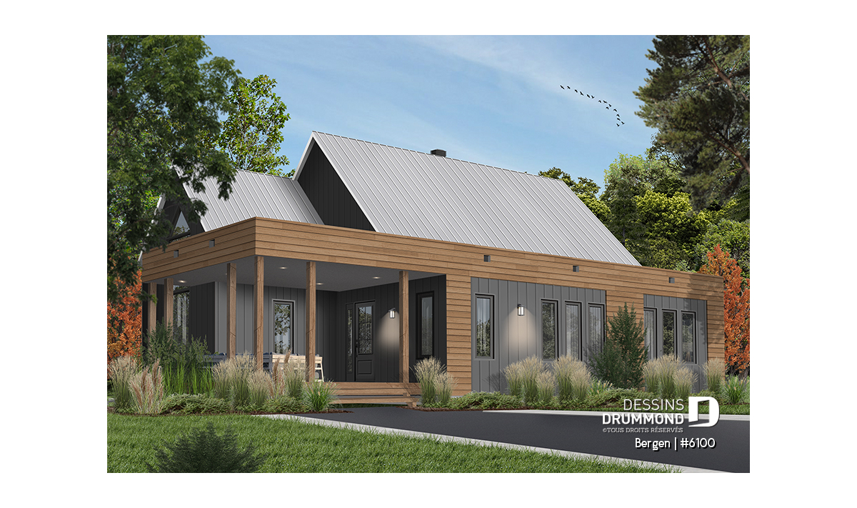 Superbe nouveau plan de maison (ou plan de chalet) de style moderne no. 6100 (aussi nommé Bergen), fortement inspiré des modèles de maison de style Scandinave. L’architecture originale de ce modèle propose plusieurs éléments des plus appréciables tels que beaucoup de lumière naturelle en façade, à l’arrière et surtout dans le secteur cuisine où une énorme fenêtre y est aménagée, au-dessus de l’évier. De plus, le grand balcon avant est couvert, et la terrasse arrière pourra aisément recevoir une pergola afin de laisser entrer la lumière au secteur salon et salle à manger. *le coût de la pergola et du toit de tôle ne sont pas inclus dans notre prix approx.