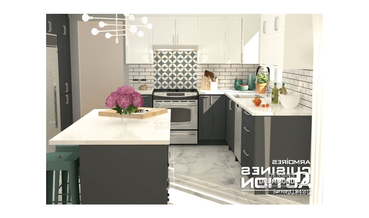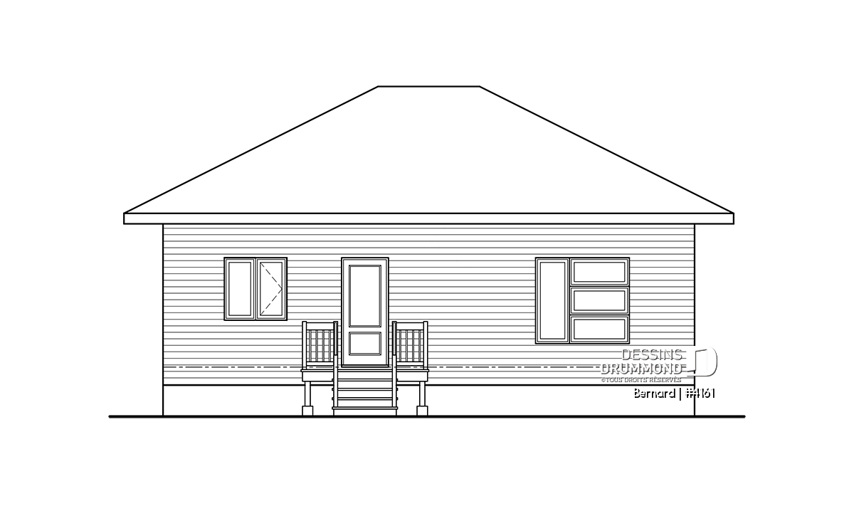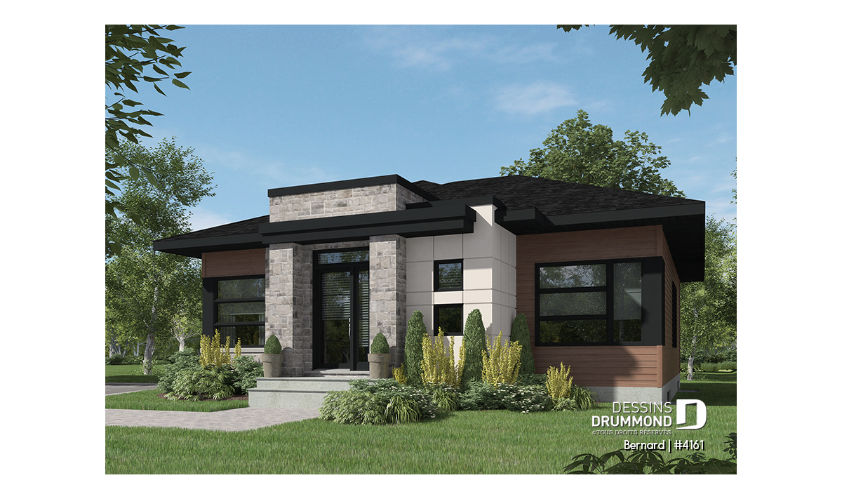 Ce nouveau plan de maison moderne # 4161 de Dessins Drummond conçu par notre agence de Lévis près de Québec propose plusieurs commodités non négligeables. D'abord un vestibule de bon format offre une grande garde-robe de type walk-in. Puis l'espace des chambres est séparée par un mur ce qui amoindrit les sons et favorise le sommeil, même s'il y a des activités au salon. La salle à manger et le salon sont séparés par un foyer central. La cuisine propose un îlot de bon format, un grand garde-manger walk-in et reçoit la lumière naturelle d'une grande fenêtre près de la salle à manger et du balcon arrière.