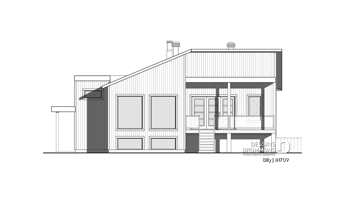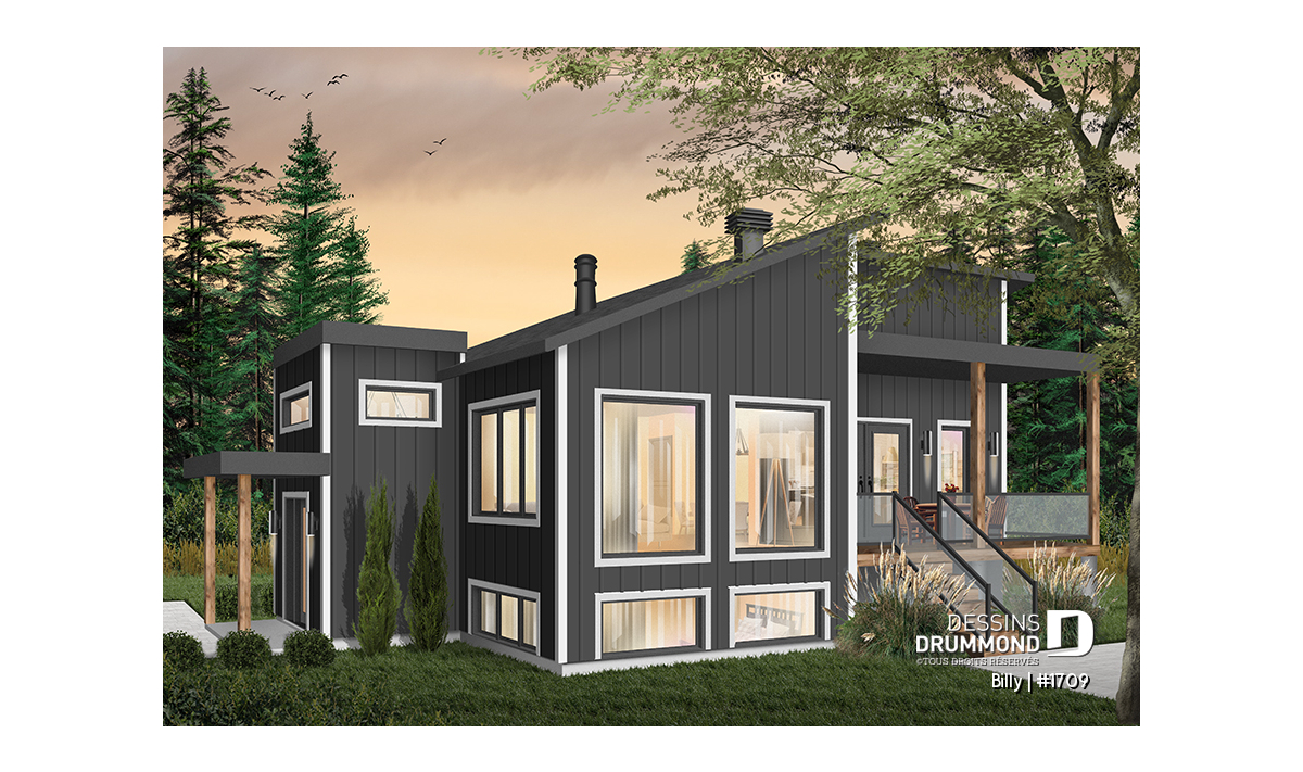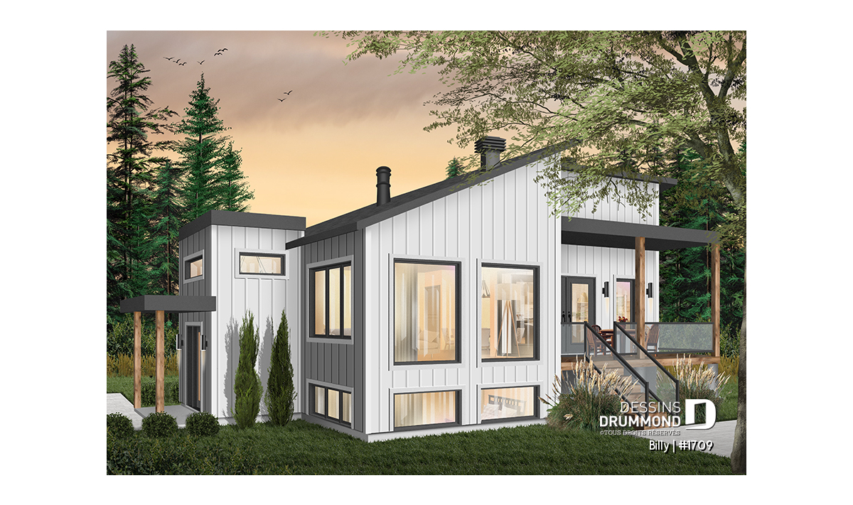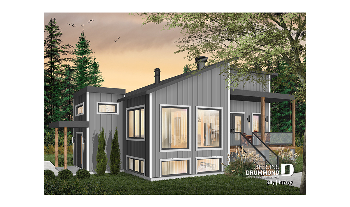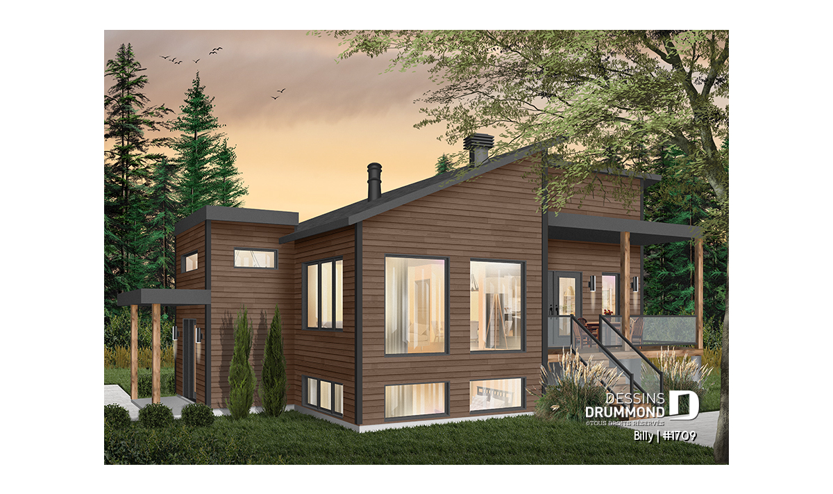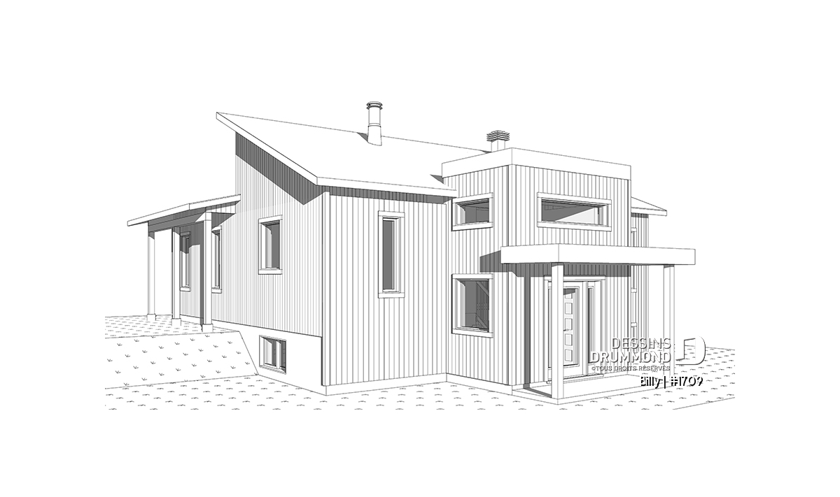 Maison d’esprit très moderne et Scandinave, conçue pour un terrain en coin ou en biais d’une vue panoramique. À l’entrée, on retrouve une grande garde-robe ainsi qu’une descend au sous-sol et une montée à l’étage principale. Avec son grand nombre de fenêtres, le rez-de-chaussée ouvert permet d’avoir une vue spectaculaire peu importe votre emplacement dans la maison. Une cuisine spacieuse avec un grand garde-manger est accompagnée d’une porte triple donnant sur une terrasse couverte située sur le côté gauche de la maison. La suite des maîtres est séparée de la salle de bain par un walk-in où on y retrouve la laveuse /sécheuse. Un poêle à bois a été aménagé au secteur d’activité, nous permettant ainsi d’imaginer que l'emplacement idéal de cette maison serait en campagne ou en forêt. Idéale pour un couple sans enfant ou avec des petits enfants. Le sous-sol a été aménager pour éventuellement y recevoir d’autres chambres.