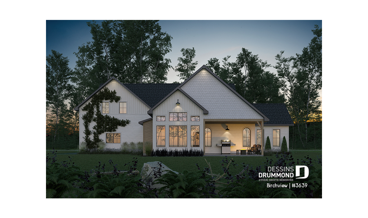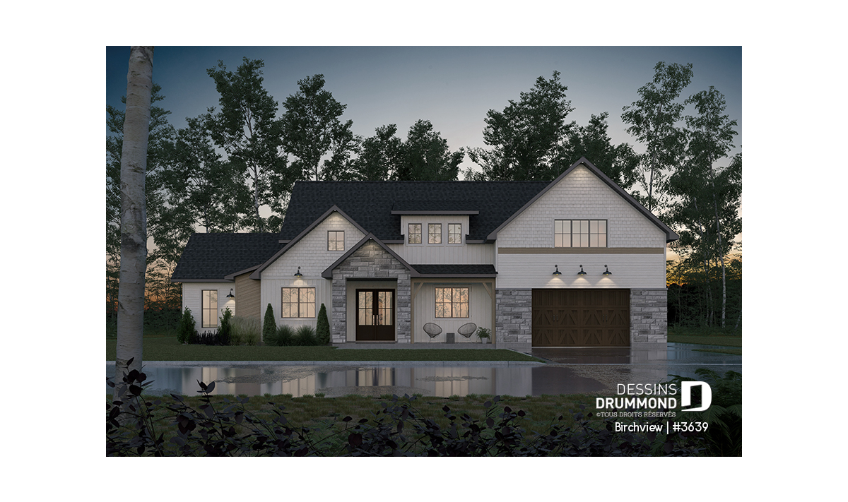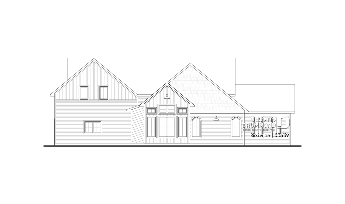 Le plan de maison BIRCHVIEW d’inspiration campagne française séduit par son charme indémodable et ses détails architecturaux soignés. Les arches, intégrées aux transitions entre les pièces, apportent une touche d’élégance unique. Dans la salle de séjour, deux superbes fenêtres en arche encadrent le foyer et créent un point focal chaleureux. Pour profiter de la vie à l’extérieur, le perron avant et la terrasse arrière couverte offrent des espaces accueillants en toute saison.