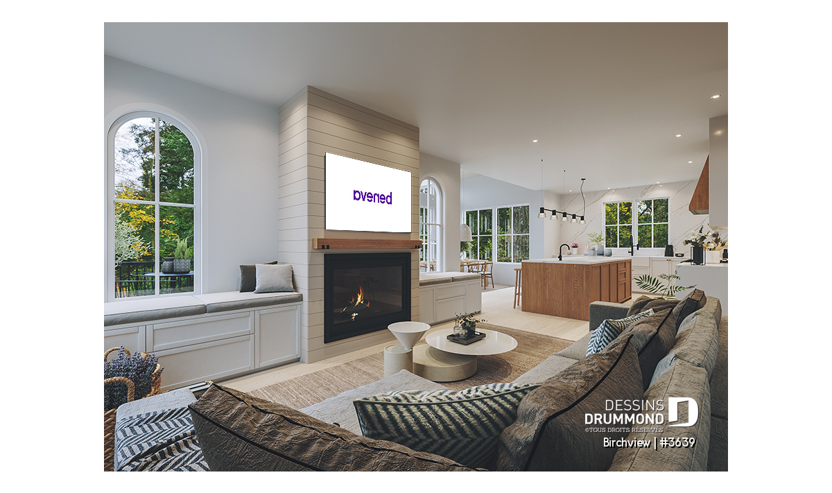 Plusieurs arches ont été intégrées en transition entre les pièces. De plus deux magnifiques fenêtres en arche encadrent le foyer à la salle de séjour.