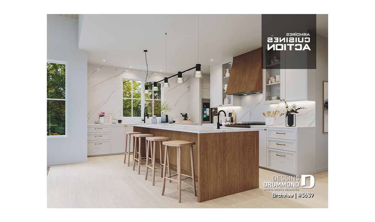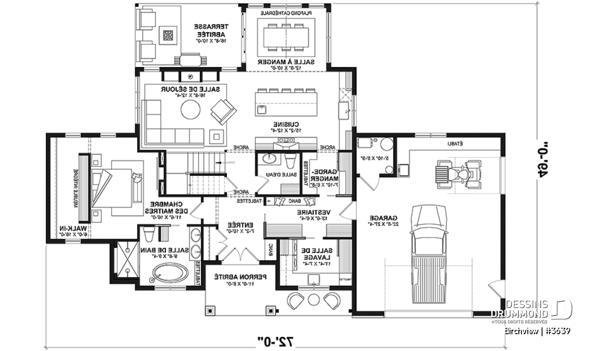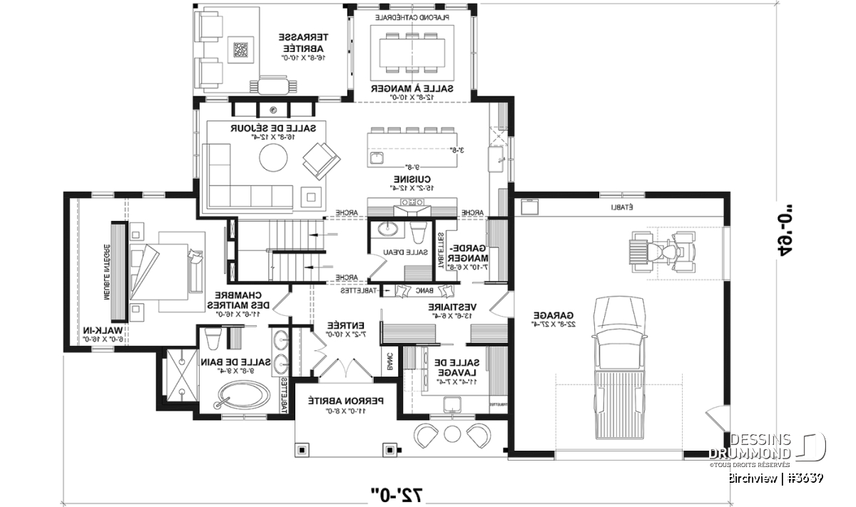 Garde-manger, Ilôt, Plafond cathédrale, Salle de lavage au rez-de-chaussée, Suite des maîtres au rdc, Terrasse abritée, Vestiaire, Walk-in double ch. maîtres, Banquette, Bain et douche séparés, Lavabo double, Plafond à plus de 8', Garage spacieux, Foyer, Arche