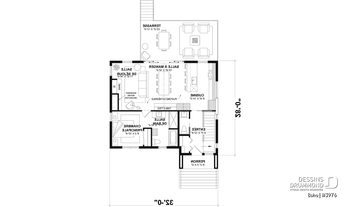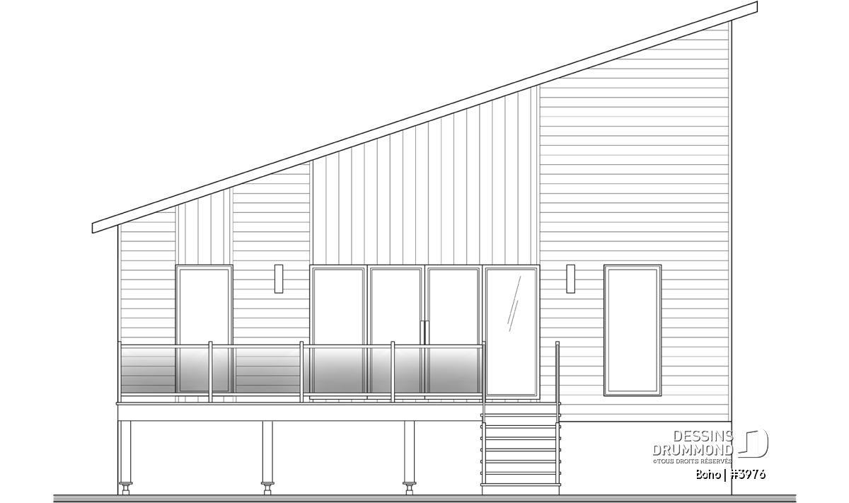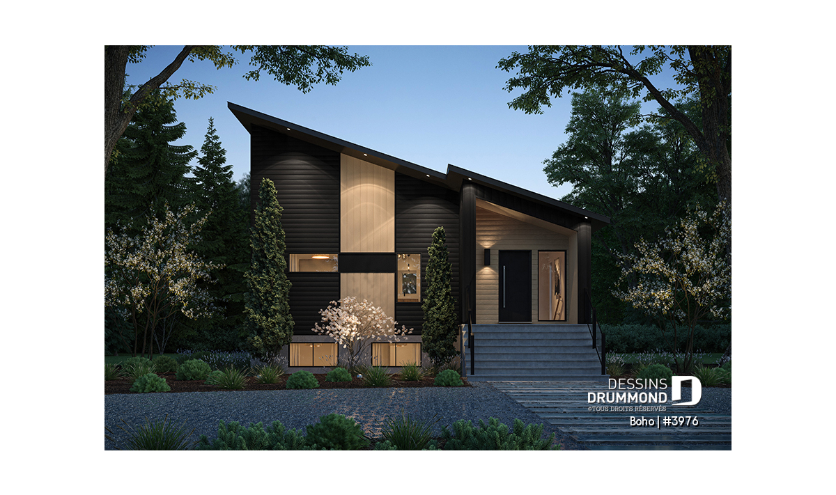 Le plan de maison Boho (#3976), moderne et de petit format, séduit par son design épuré, sa luminosité abondante et son aménagement ingénieux, parfaitement adapté aux besoins d’aujourd’hui. Dès l’arrivée, le perron avant abrité offre un accueil chaleureux tout en assurant confort et protection en toute saison, créant une première impression à la fois soignée et invitante.