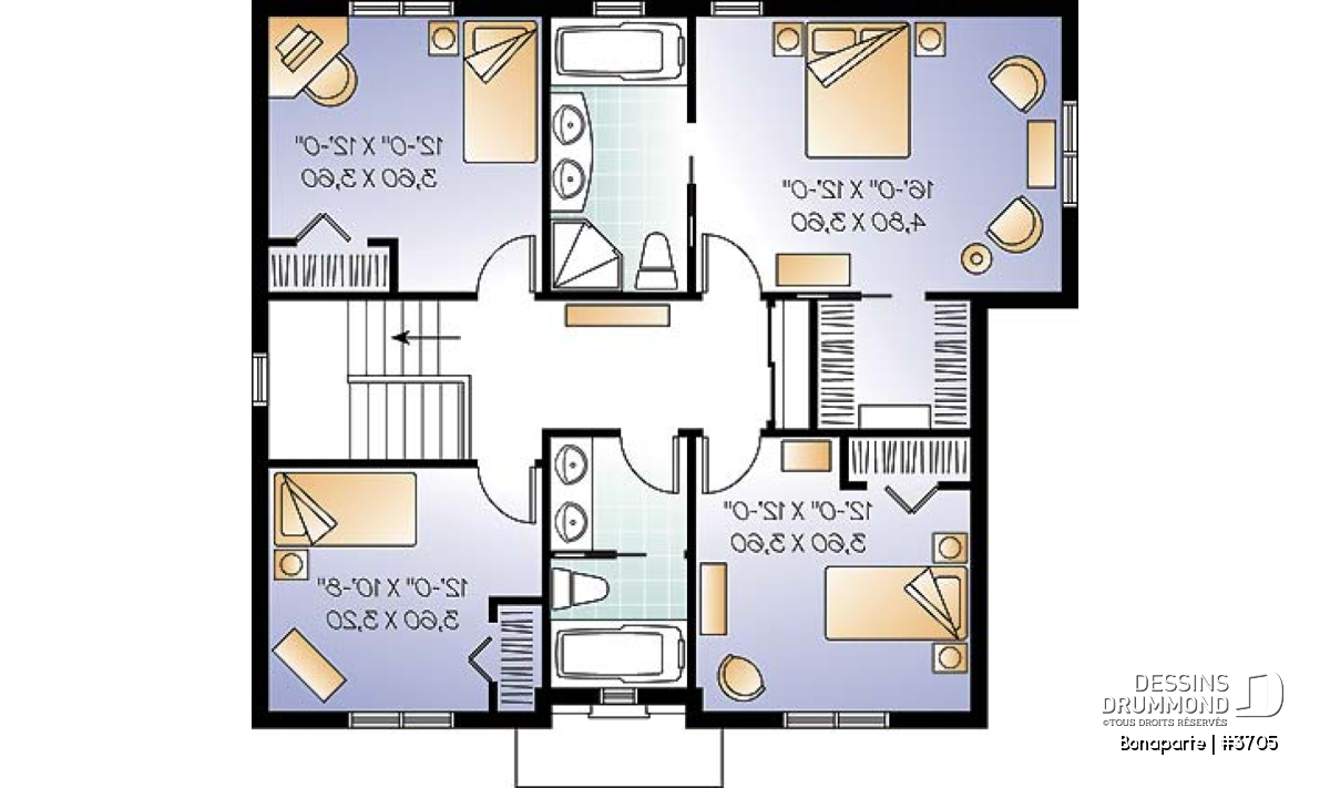 Celui-ci doit être sérieusement considéré avec ses quatre chambres à coucher toutes d’excellent format ( la plus petite faisant 12’ x 10’-8’’ ), ses deux salles de bain dont une propre à la suite des maîtres dotée, pour sa part, d’une garde-robe de type « walk-in ». Sans oublier, à l’étage, une lingerie de près de 7’ de largeur soit la largeur du corridor ( si on peut l’appeler ainsi…).