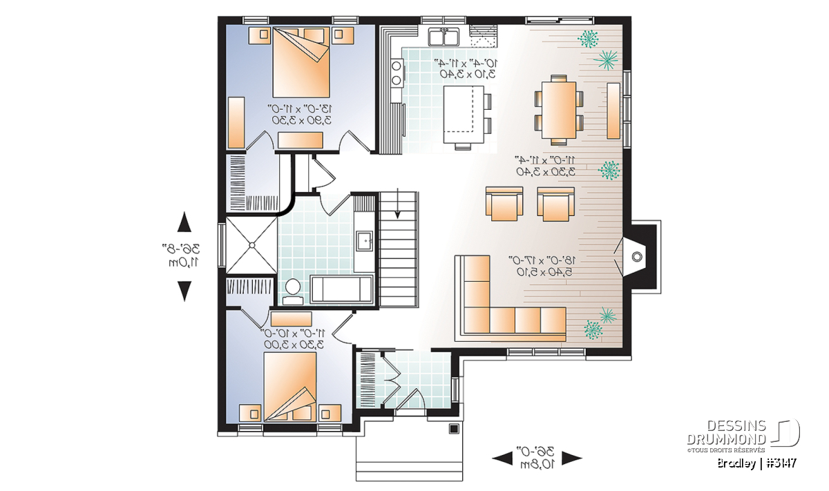 À l’intérieur par contre, et en raison de la demande unanime pour les espaces ouverts, il propose tout ce dont rêve les acheteurs soit : un vestibule à l’entrée avant avec garde-robe fort adéquate et, attenant à celle-ci, une chambre 2 ou espace bureau à domicile fort bien localisé. Sans oublier, un secteur activités entièrement ouvert avec foyer à la salle de séjour et îlot-lunch à la cuisine, un secteur repos regroupant deux chambres de bon format dont une chambres des maîtres avec garde-robe walk-in. Sans oublier, une salle de bain complète avec bain autoportant et douche de 54po x 60po pour le plus grand bonheur des futurs propriétaires.