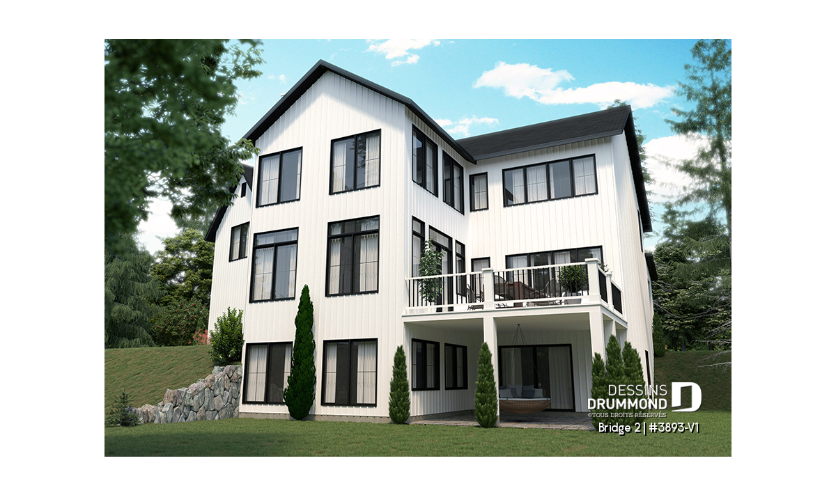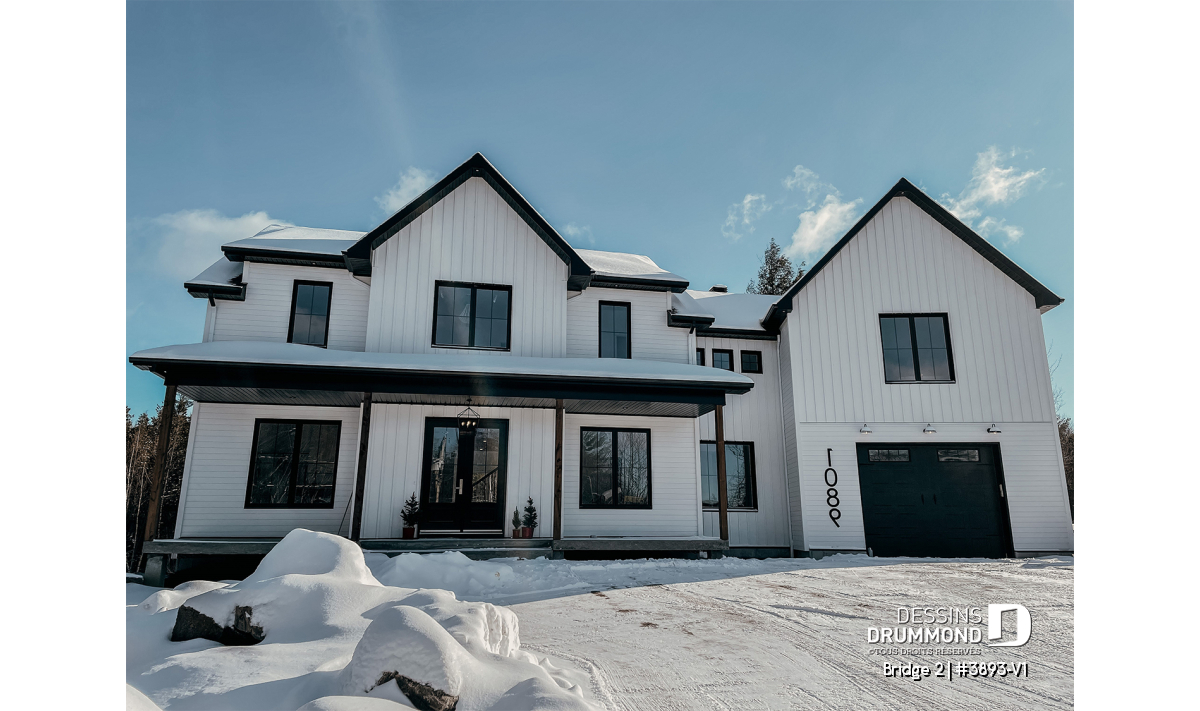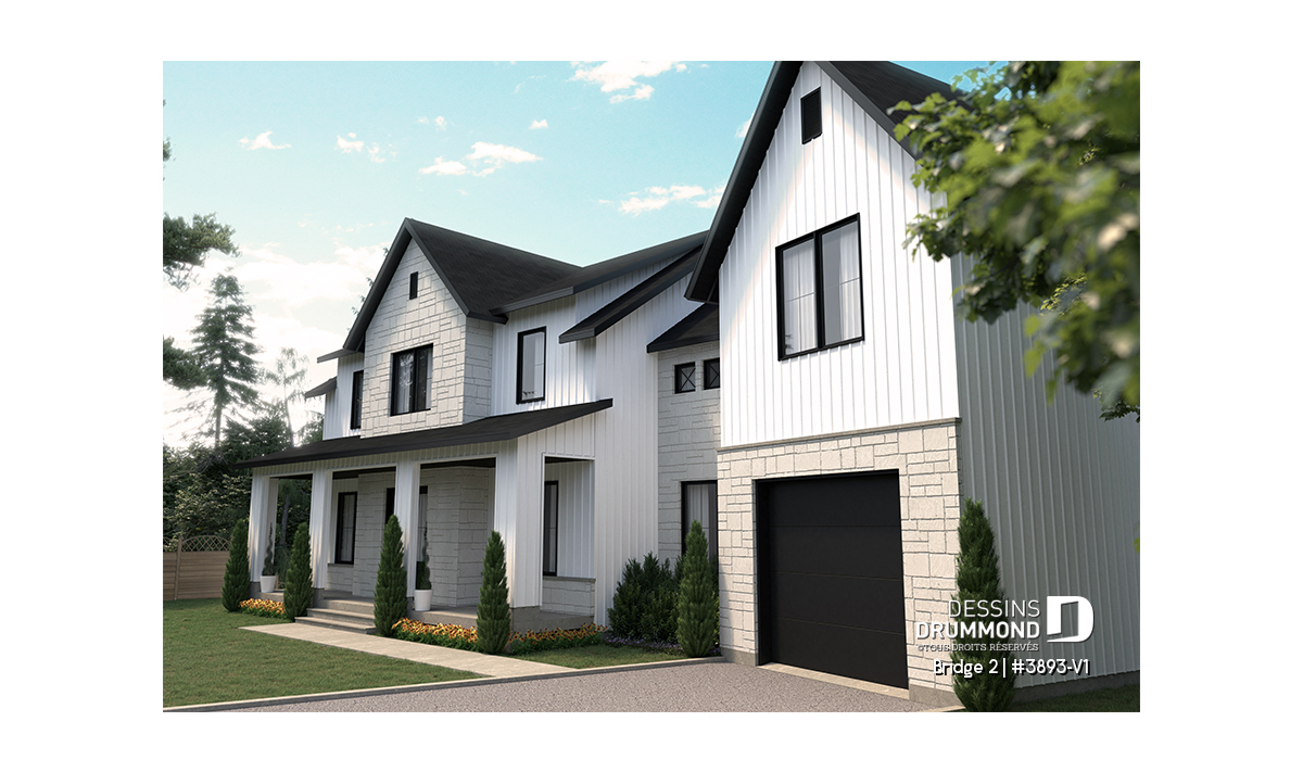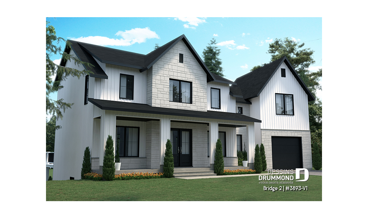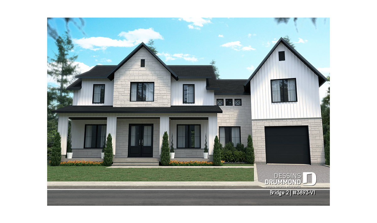 Découvrez le superbe plan de maison de style farmhouse BRIDGE 2 (#3893-V1) avec garage, proposant un confortable 3313 pi.carré de surface aménagée, en plus d'un sous-sol non fini de type rez-de-jardin, additionnant au besoin, 1435 pi.ca. à aménager.