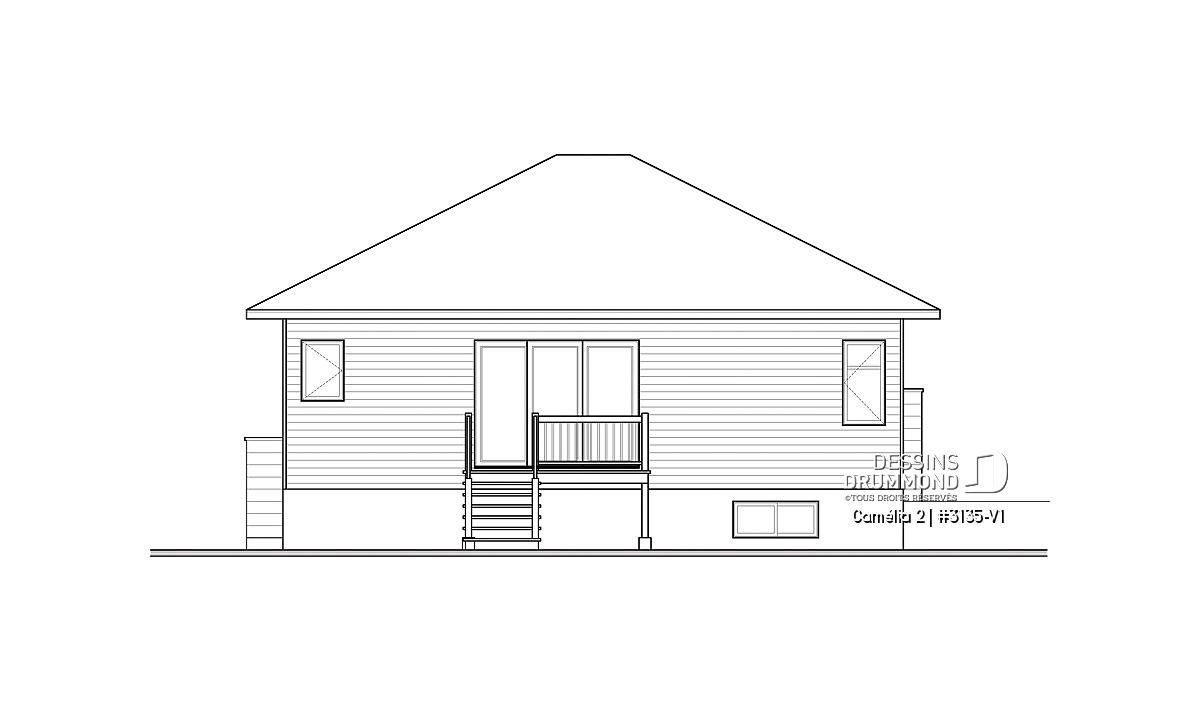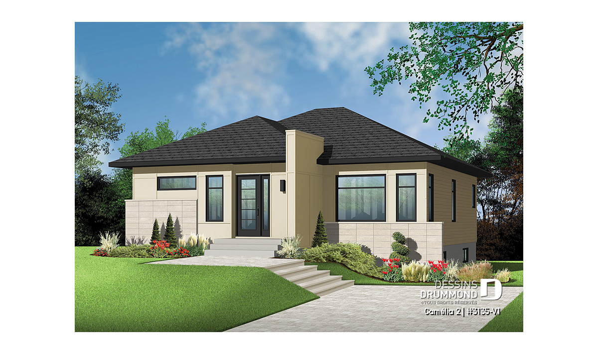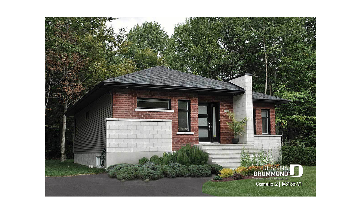 Ce plan est la preuve qu'une maison plein pied n'a pas besoin d'être plate! Le style architectural de l'entrée et les fenêtres modernes donnent un style originale à cette belle maison.