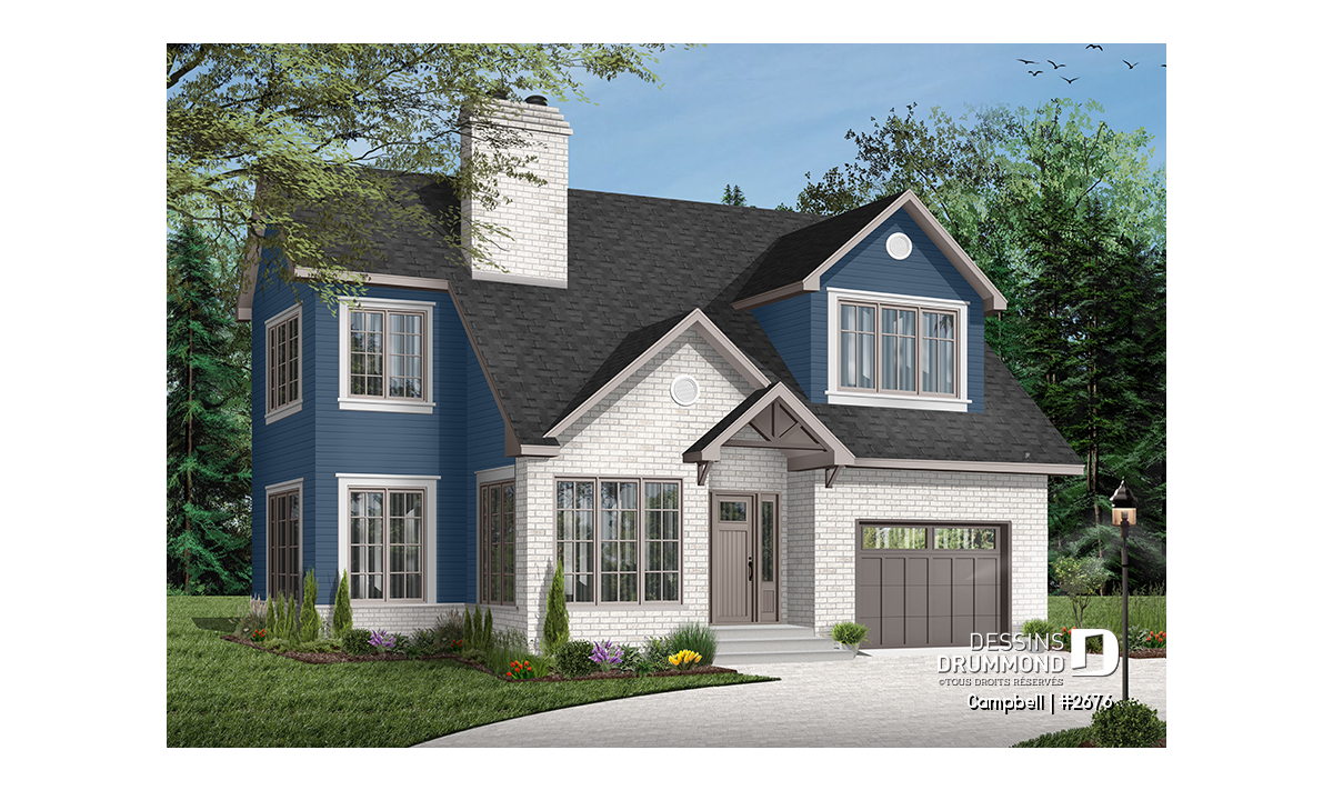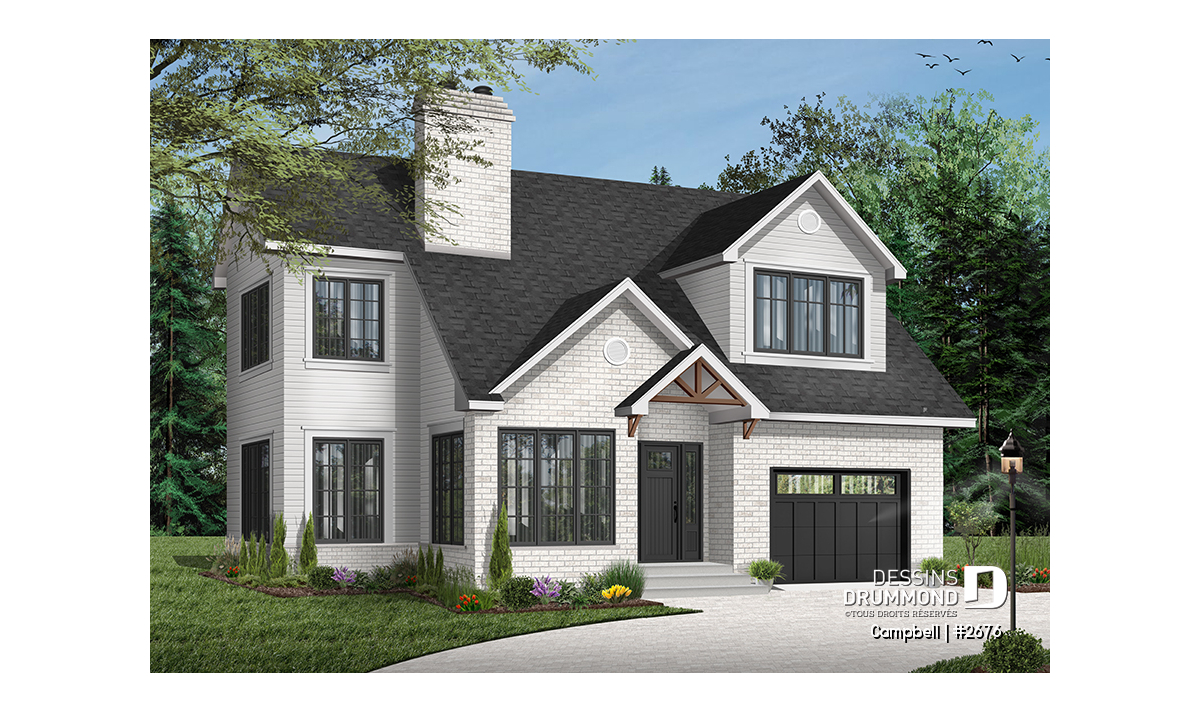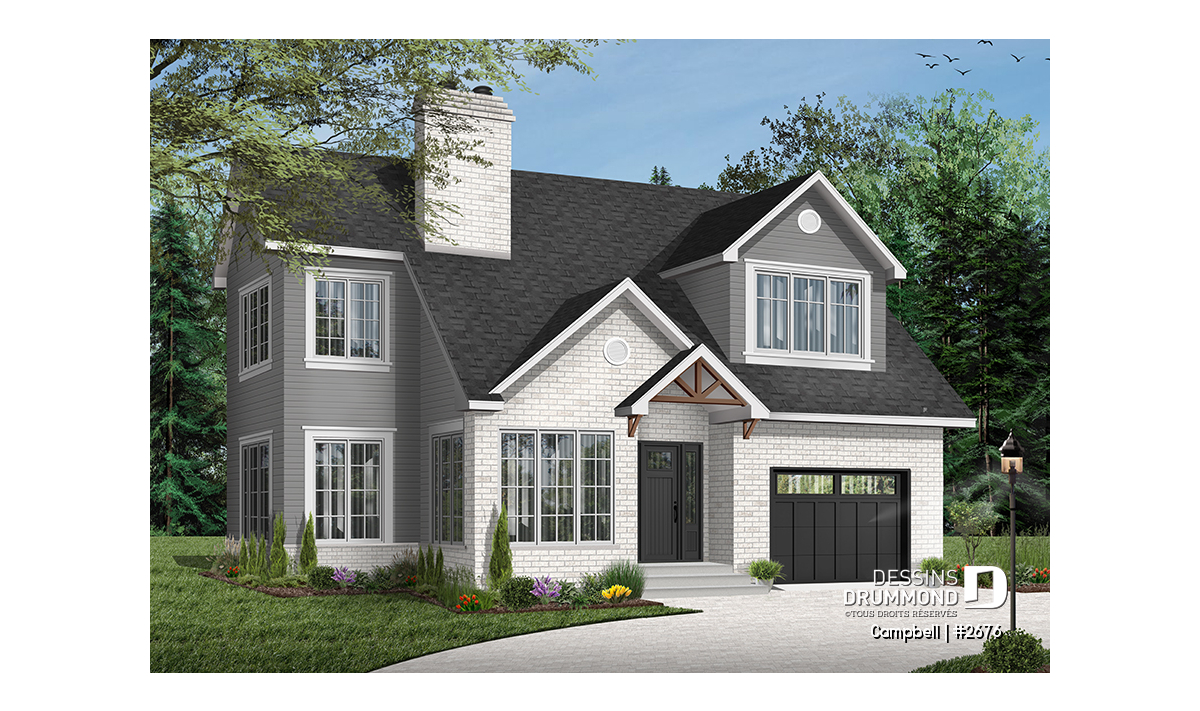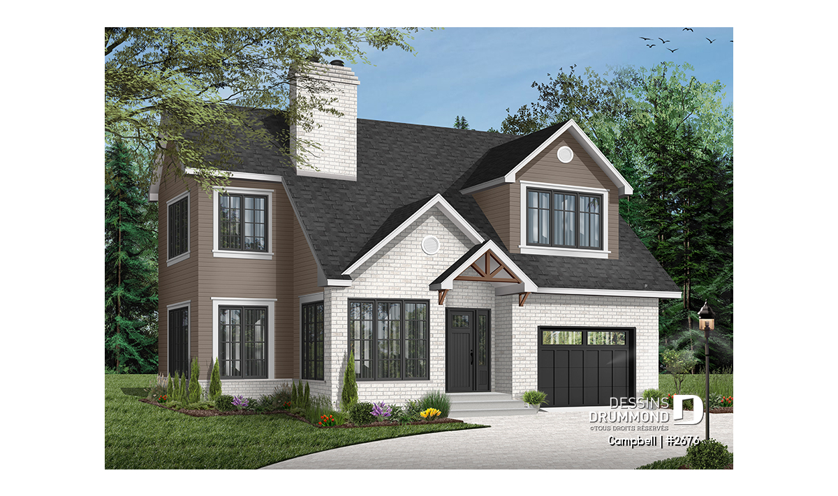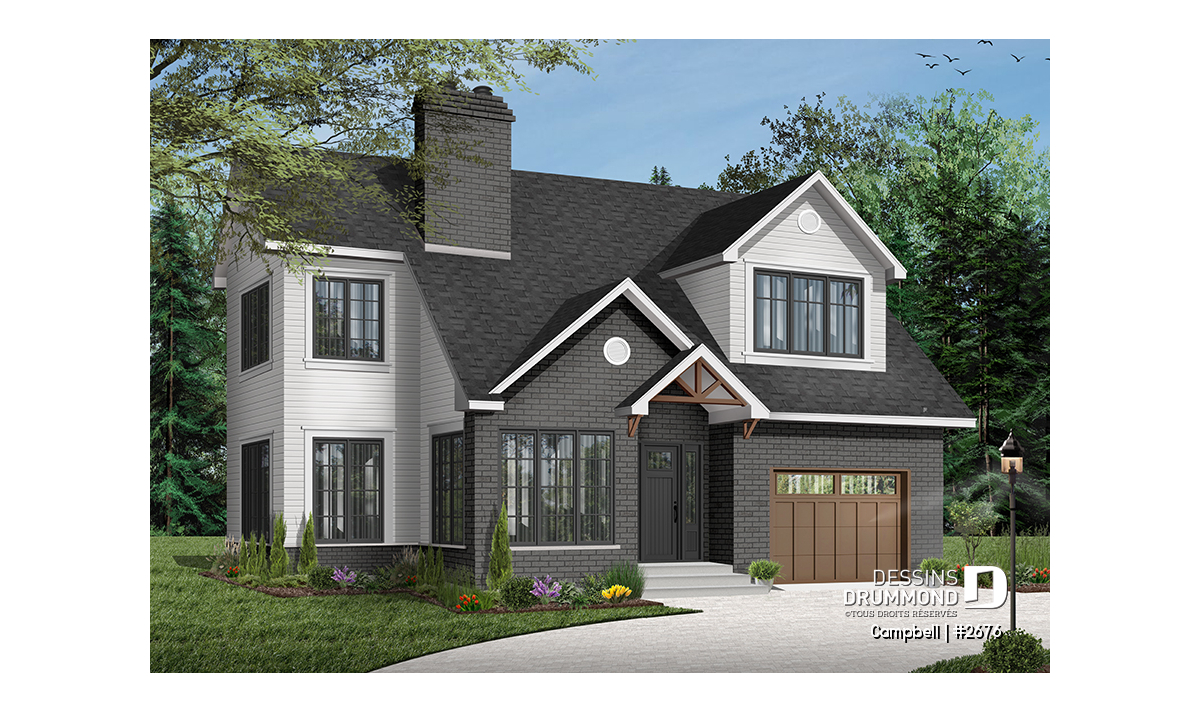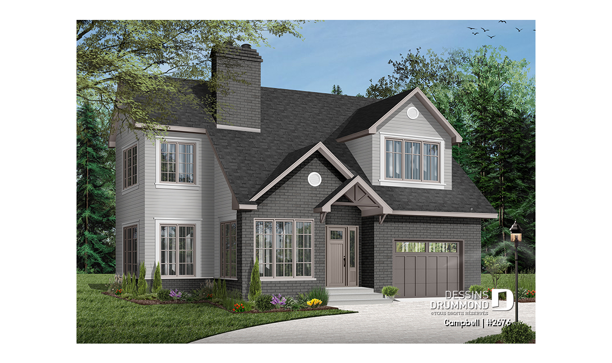 Le sous-sol, prêt à être aménagé, permet d’envisager de multiples configurations selon l’évolution des besoins. Finalement, le garage simple, avec un accès direct à proximité de la cuisine, contribue à rendre le quotidien plus fluide et pratique. Le modèle CAMPBELL (#2676) représente une solution résidentielle équilibrée, moderne et adaptée aux terrains étroits d’aujourd’hui.