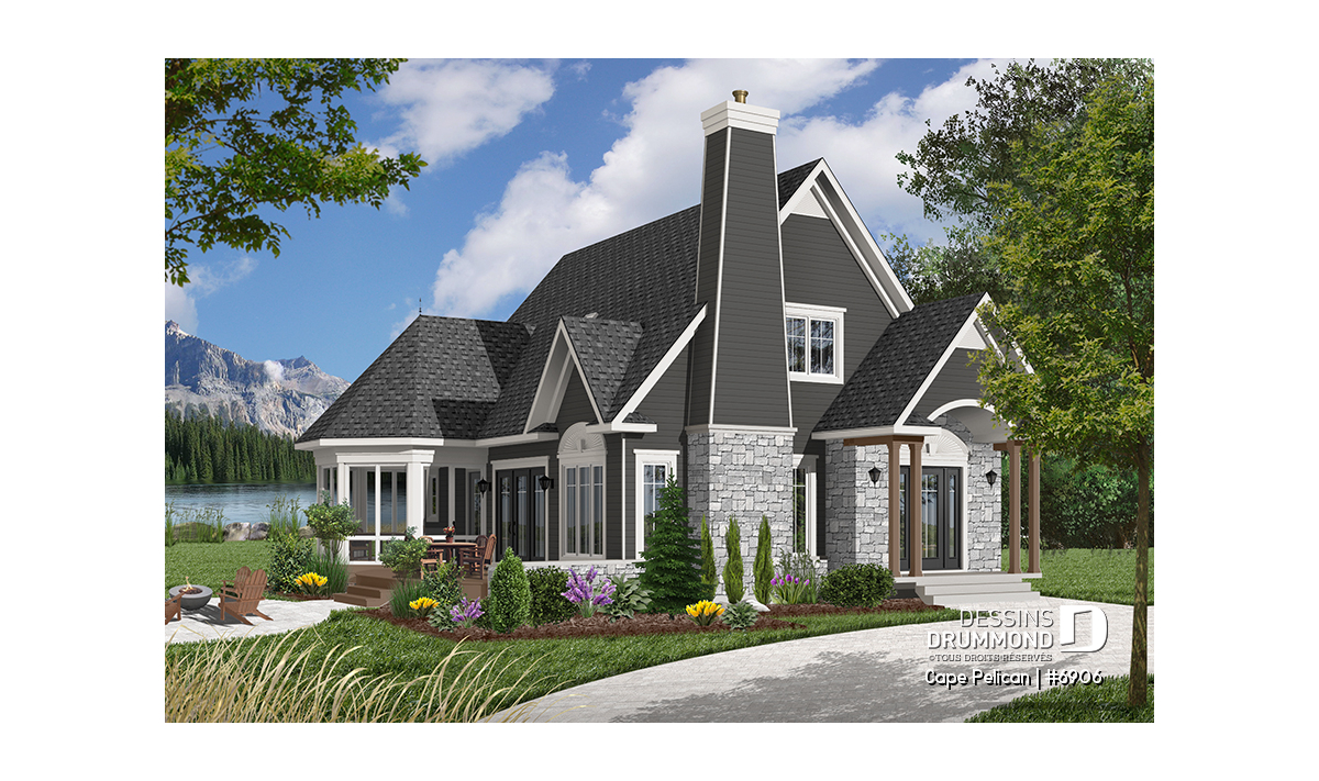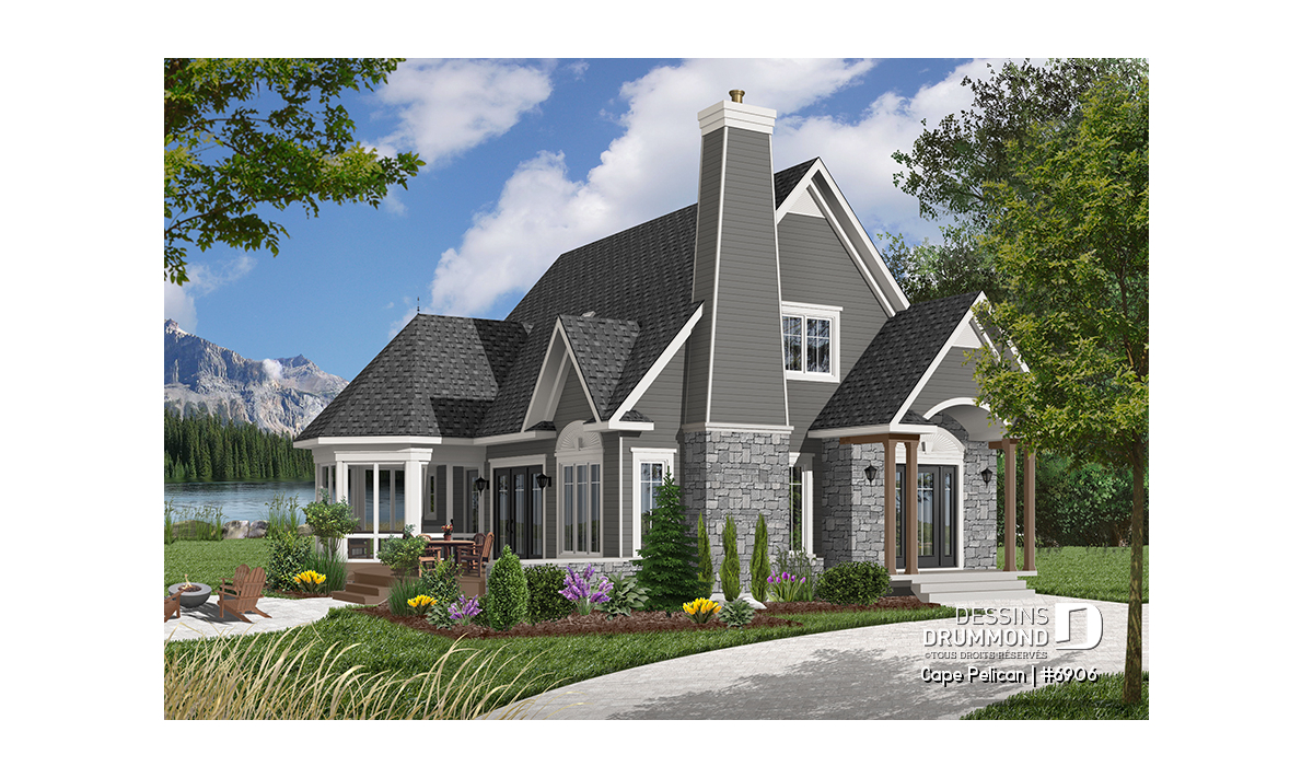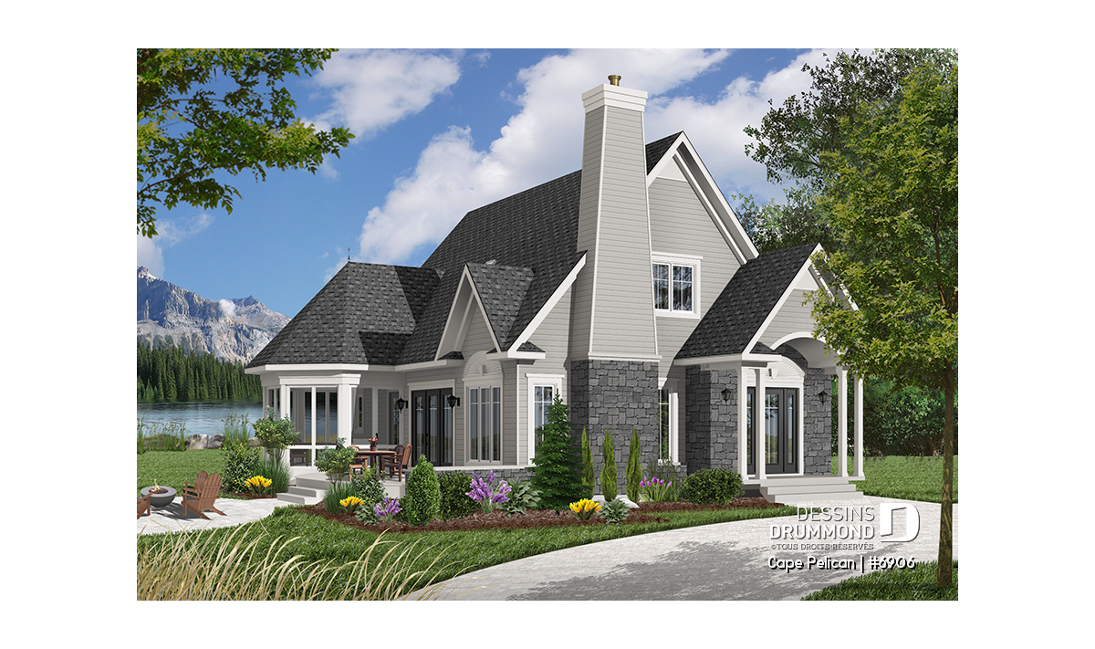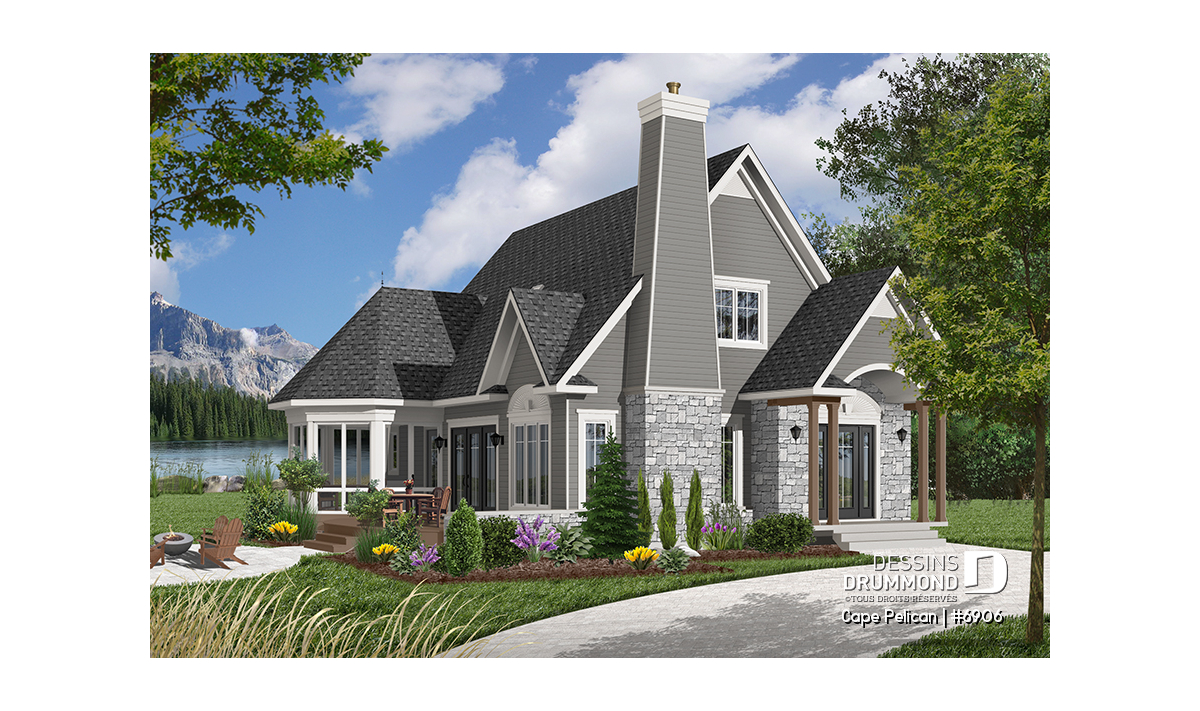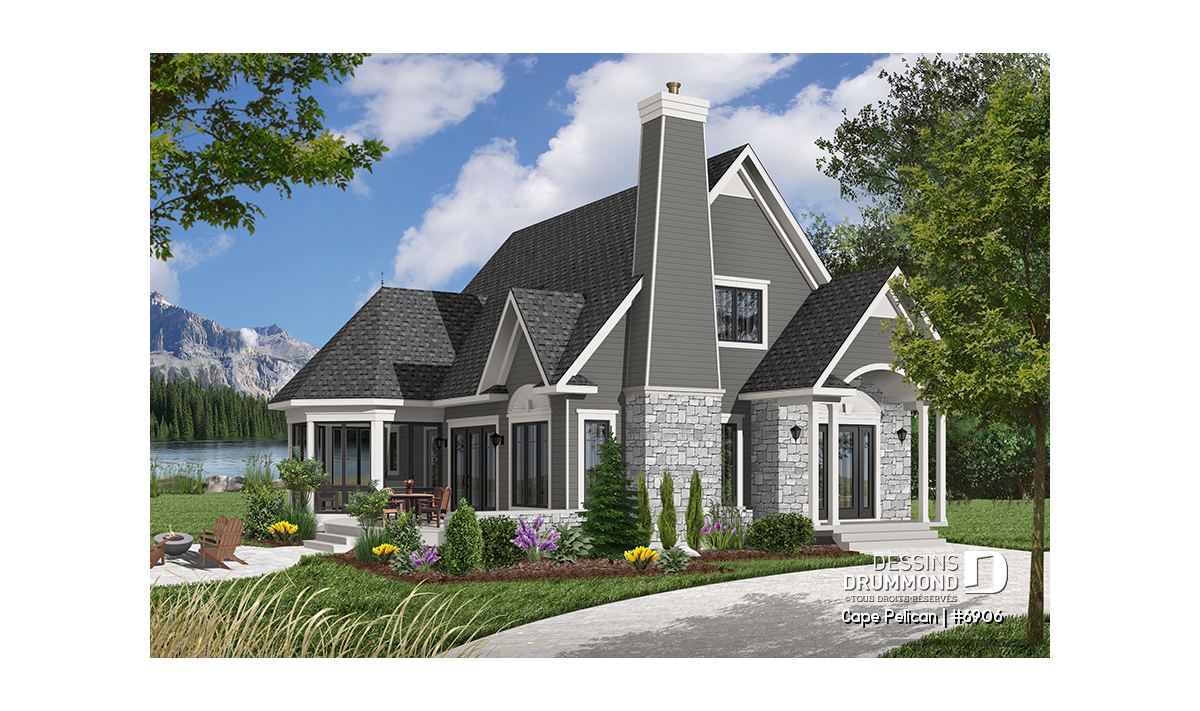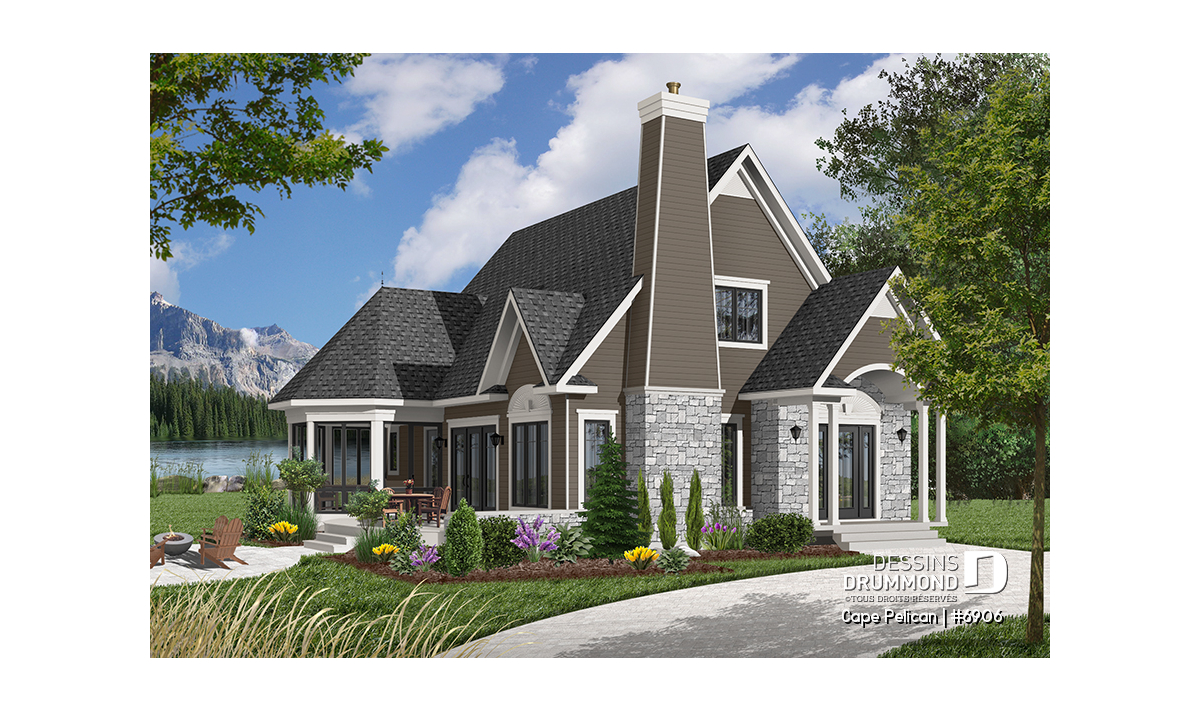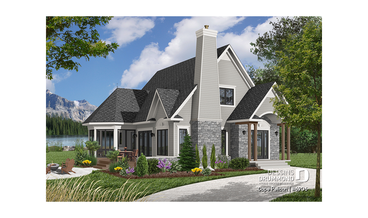 Version couleur no. 7 - Vue avant - Maison genre chalet 4-saisons, chambre maître au r-d-c, foyer, vestibule, grande terrasse, abri moustiquaire - Cape Pelican