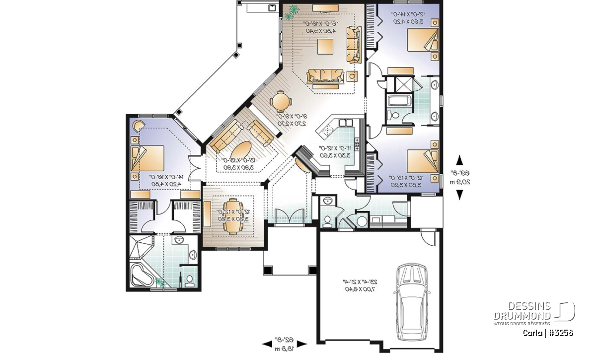 Plafond à 11'-4" à l'entrée, la salle à manger, la salle de séjour, la suite chambre des maîtres, la cuisine, la dînette et la salle familiale. Plafond à 10'-0" aux chambres secondaires et aux utilités. Plafond cathédrale à la salle de bain de la chambre des maîtres. Entrée principale bien abritée tout comme le patio arrière qui l'est en totalité tout en étant accessible de la chambre des maîtres et de la salle familiale. Belle organisation intérieure avec angles permettant une minimisation de corridor et une maximisation de l'espace viable. Grand espace dînette pouvant fort bien être converti en salle à manger et permettant à celle-ci d'être aménagée en bureau ou en salle de jeux.