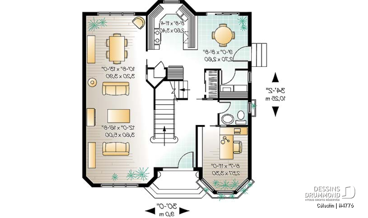 Doté de volumes bien balancés et d’une fenestration plus que remarquable en façade principale, ce cottage plan no. 4776 de Dessins Drummond, aussi appelé Célestin, nous charme dès qu’il apparaît à nos yeux. La couleur relevée, suggérée par l’enduit acrylique aux murs, n’est assurément pas étrangère à cet effet immédiat. Entrons donc voir si l’intérieur se veut aussi accrocheur.