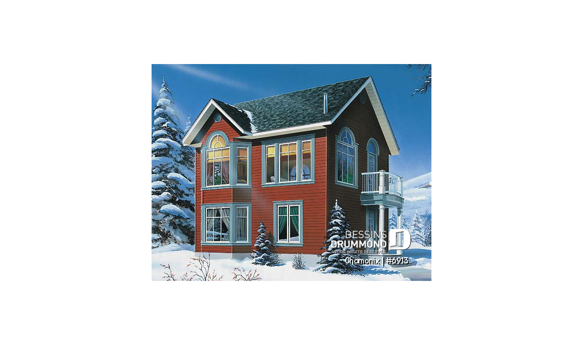 Plan de chalet aux planchers inversés, cuisine et salon à l'étage, chambres au rez-de-chaussée, panoramique