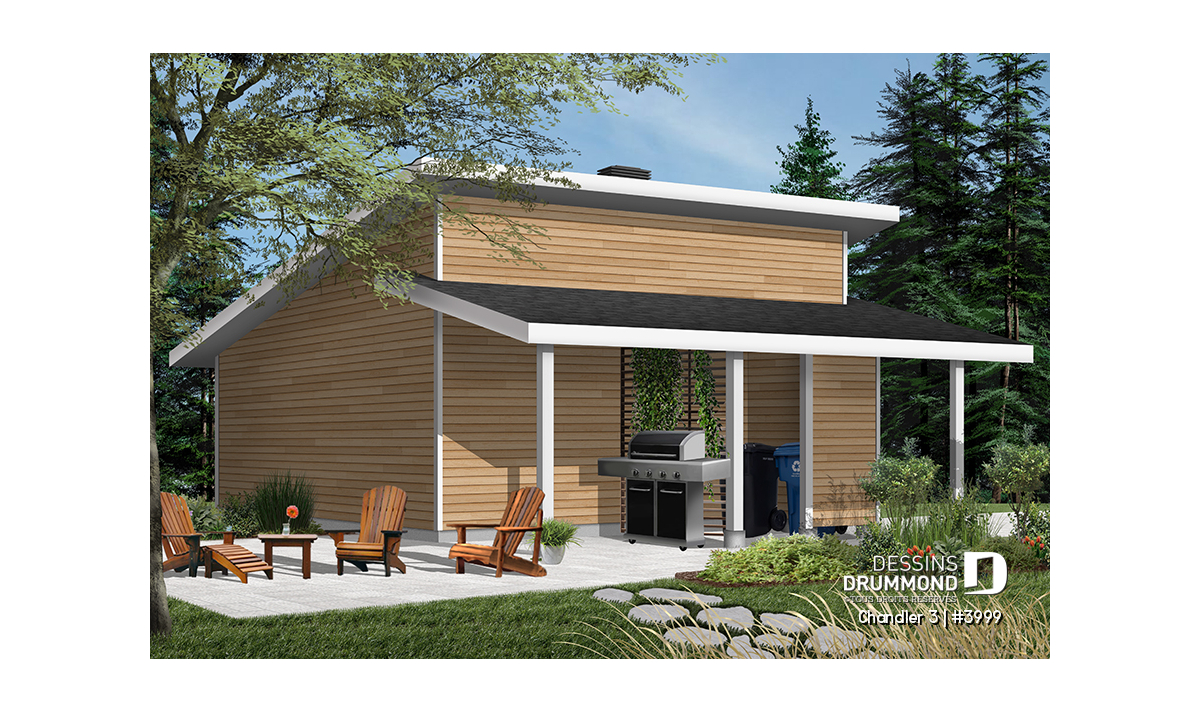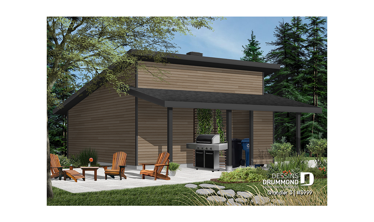 Plan de garage double, de style moderne, avec secteur abritée pour BBQ et rangement