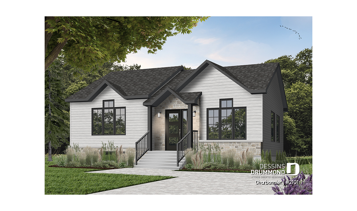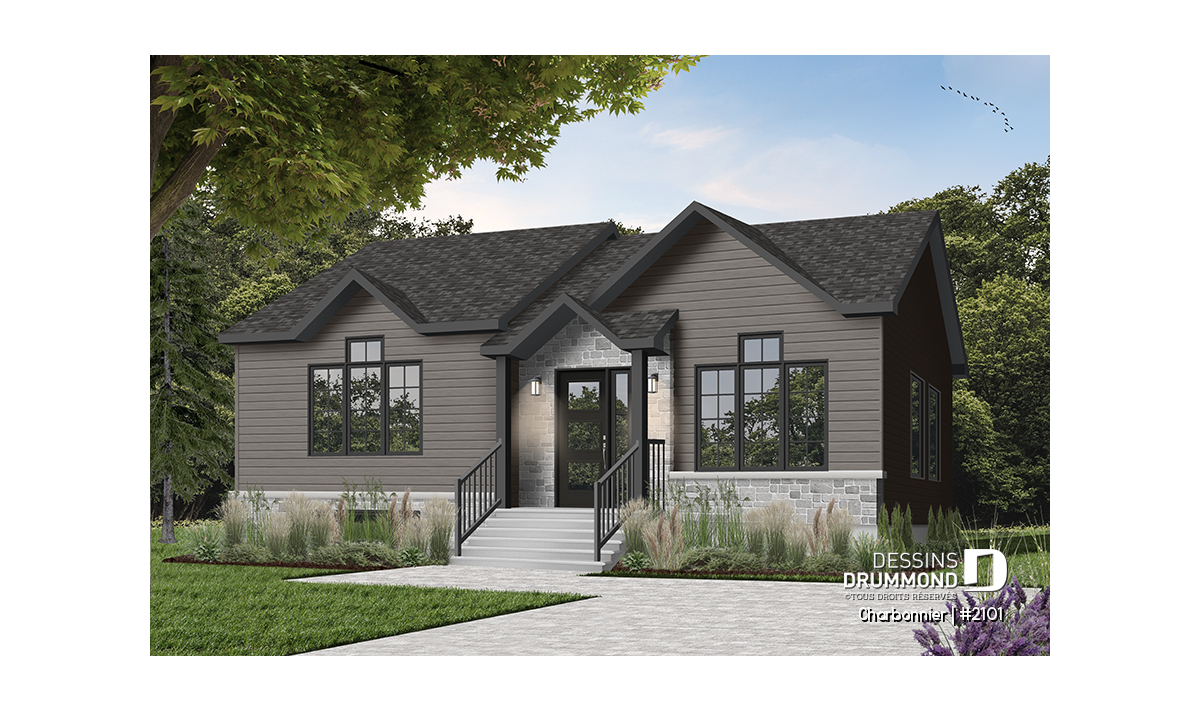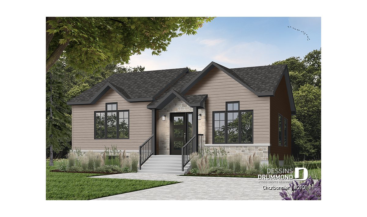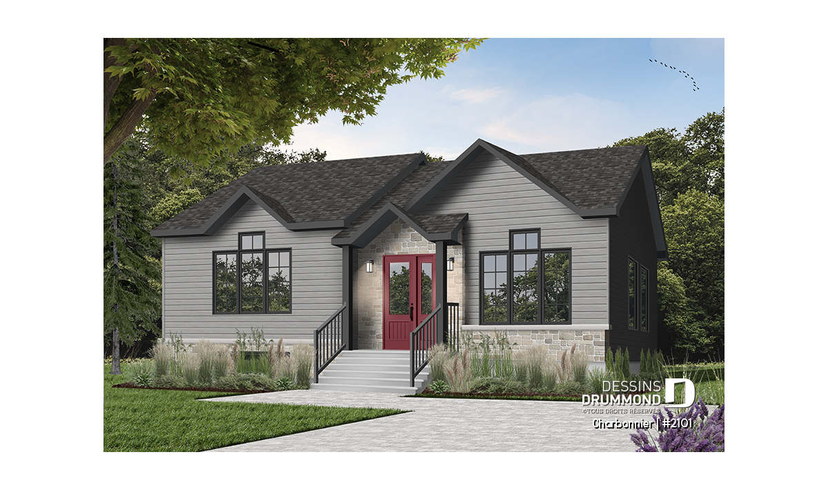 Version couleur no. 4 - Vue avant - Plan plain-pied économique 3 chambres, plafond cathédrale, salle lavage au rez-de-chaussée - Charbonnier