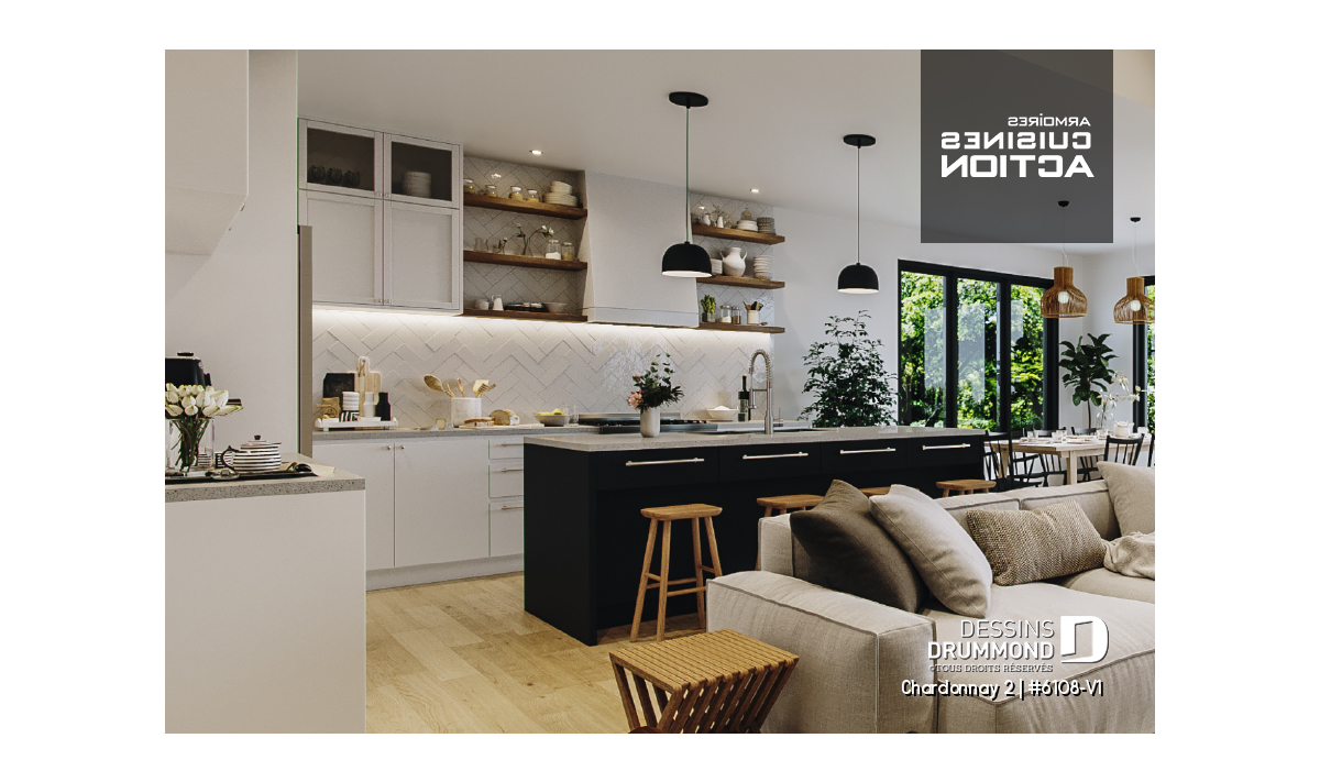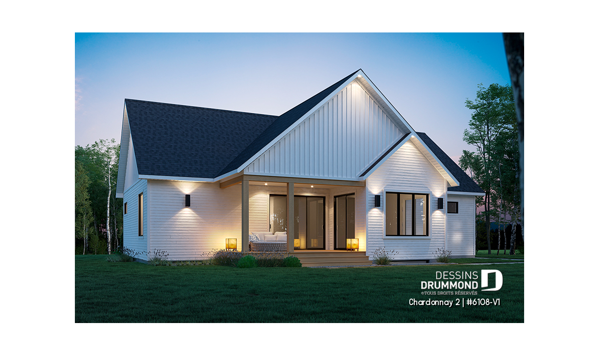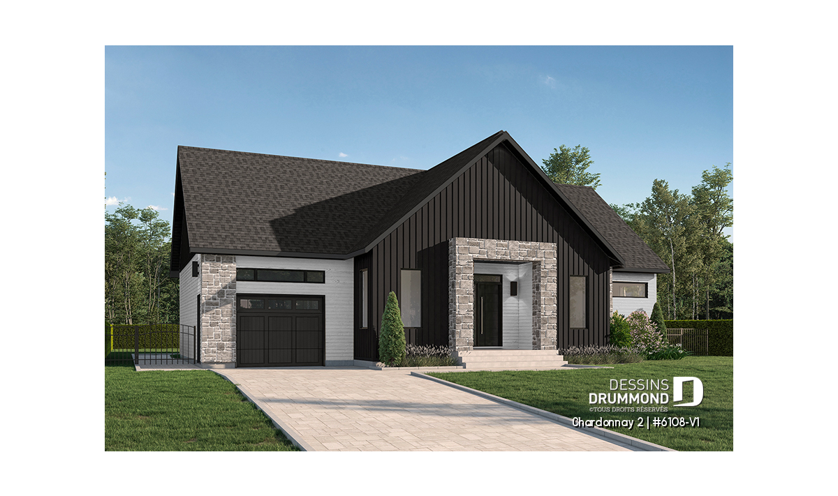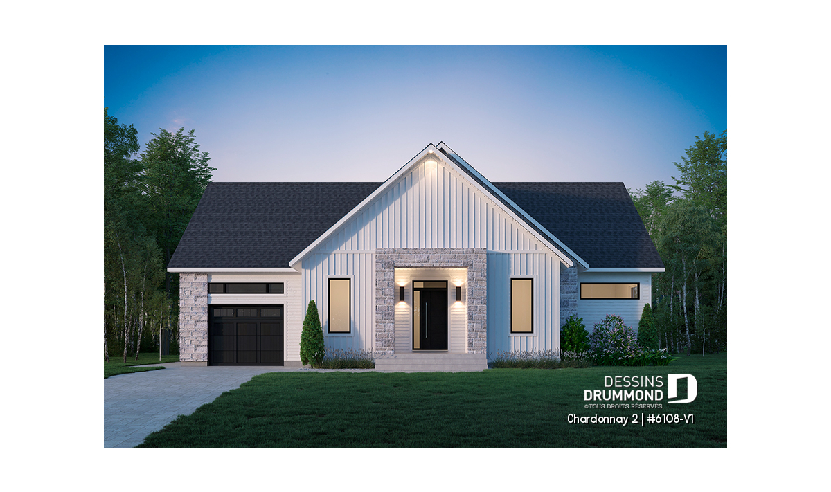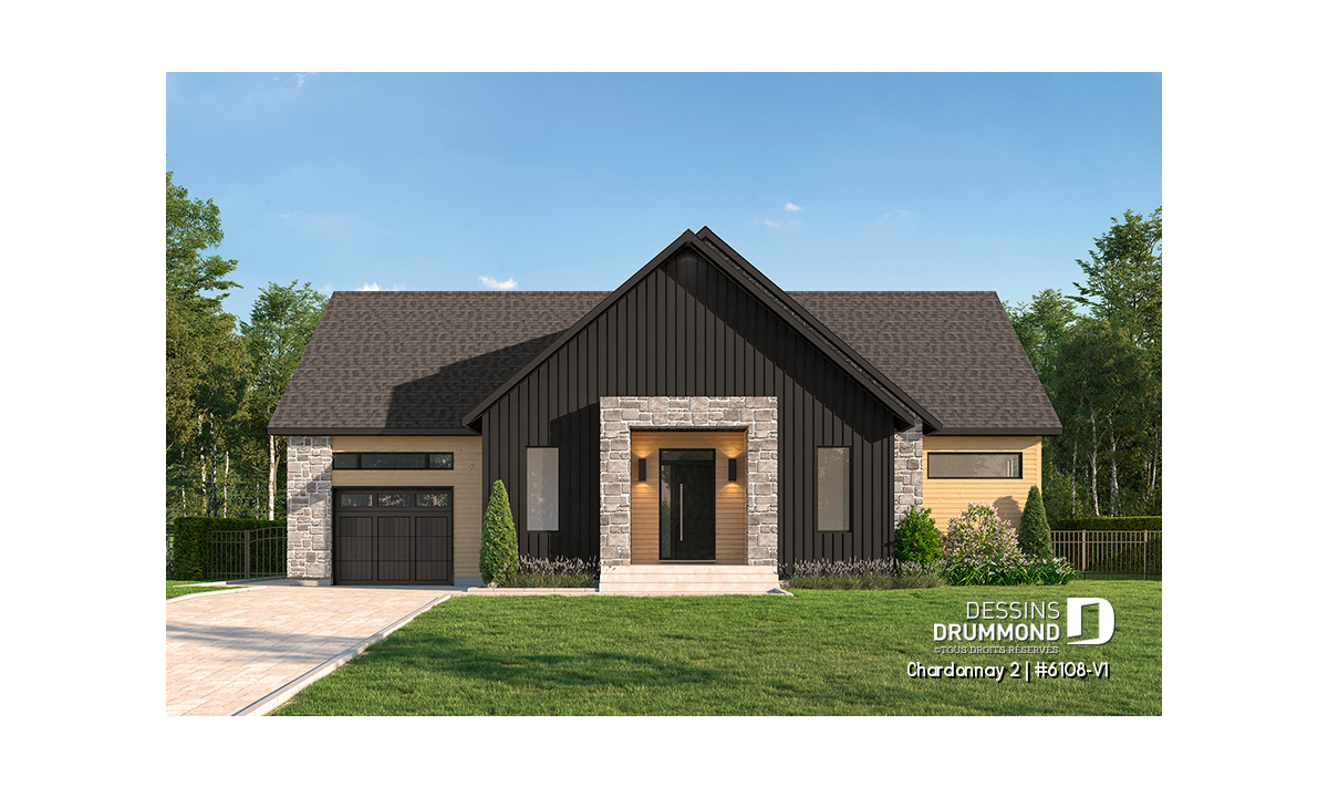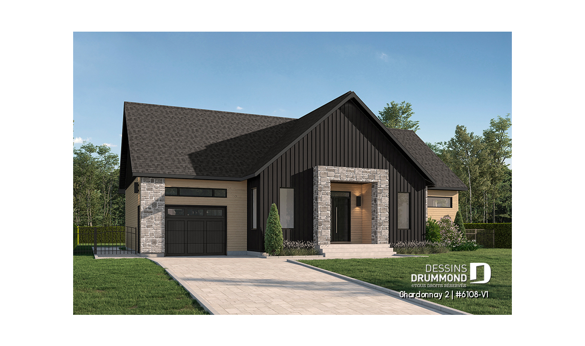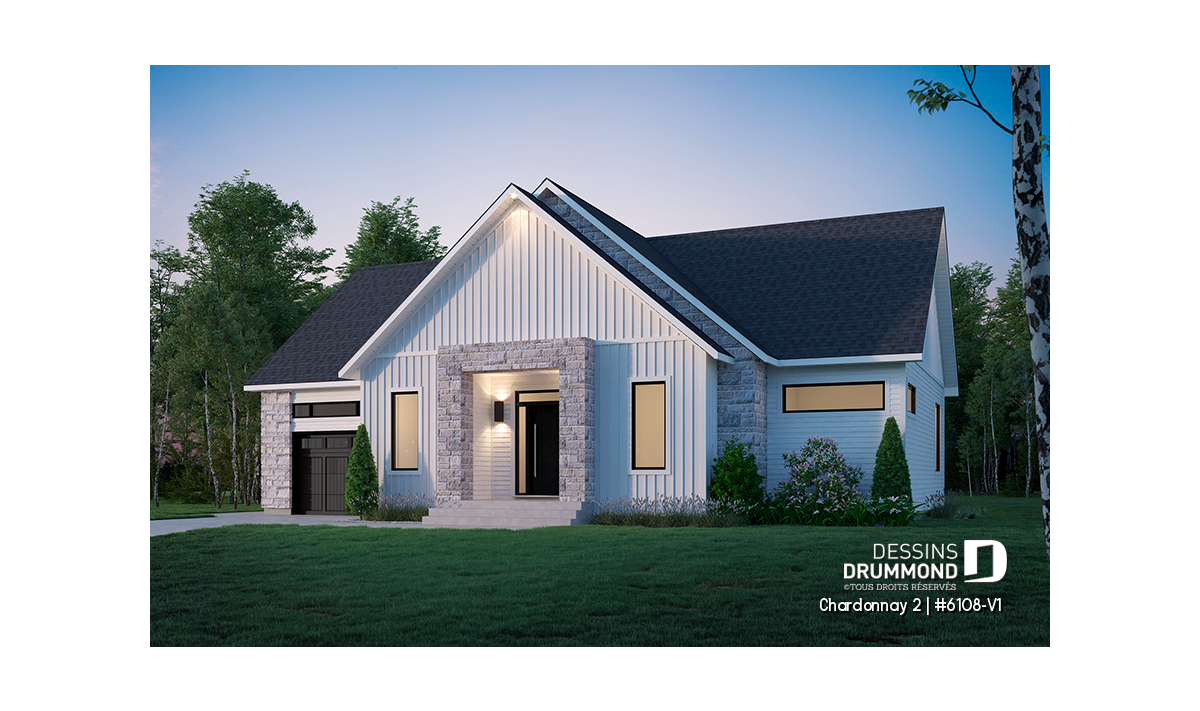 Le plan de maison Chardonnay 2 (#6108-V1) propose 1487 pi.ca. aménagés sur un seul plancher. Ce plan de type plain-pied avec garage de style Moderne Scandinave propose un look épuré tout en maximisant les espaces intérieurs et extérieurs, tel le balcon avant et la terrasse arrière qui sont tous les deux abrités.