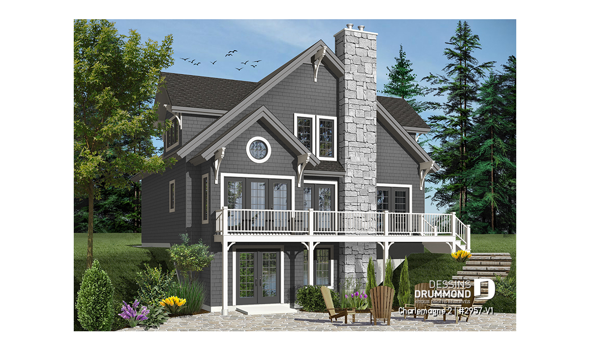 Il en va donc de même pour ce 2957-V1 avec, en prime, un agrandissement du volume principal permettant l’obtention d’un coin lecture à une chambre des maîtres passablement agrandie au rez-de-chaussée ainsi que deux chambres de plus grand format à l’étage dont une à laquelle on a ajouté une lucarne afin de la rendre encore plus attrayante. Toujours à l’étage, la mezzanine aménagée sur le plan d’origine 2957, et jumelée au plafond cathédrale de la salle de séjour, fait place ici à une seconde salle de séjour ou salle familiale avec lucarne de grand format procurant ainsi un espace suffisamment intéressant pour la visite surprise que l’on gardera à coucher.