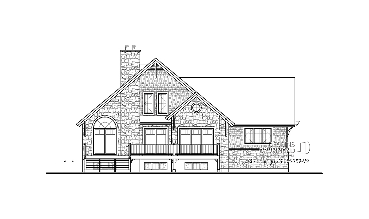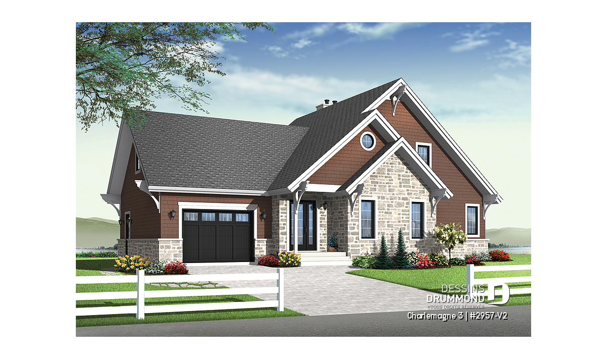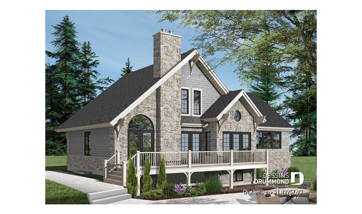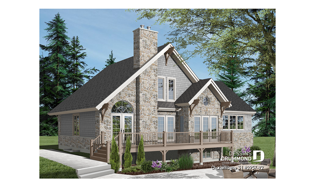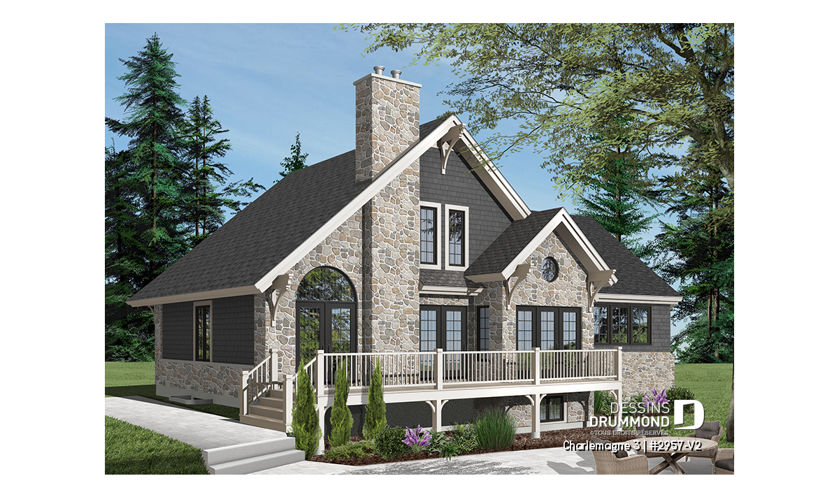Le plan CHARLEMAGNE 3 (#2957-V2) propose une maison de style chalet rustique avec garage, conçue pour offrir une luminosité exceptionnelle et une connexion privilégiée avec l’environnement naturel. Parfaitement adaptée aux terrains boisés ou en bord de l’eau, cette résidence mise sur des espaces ouverts, des vues dégagées et une ambiance chaleureuse.