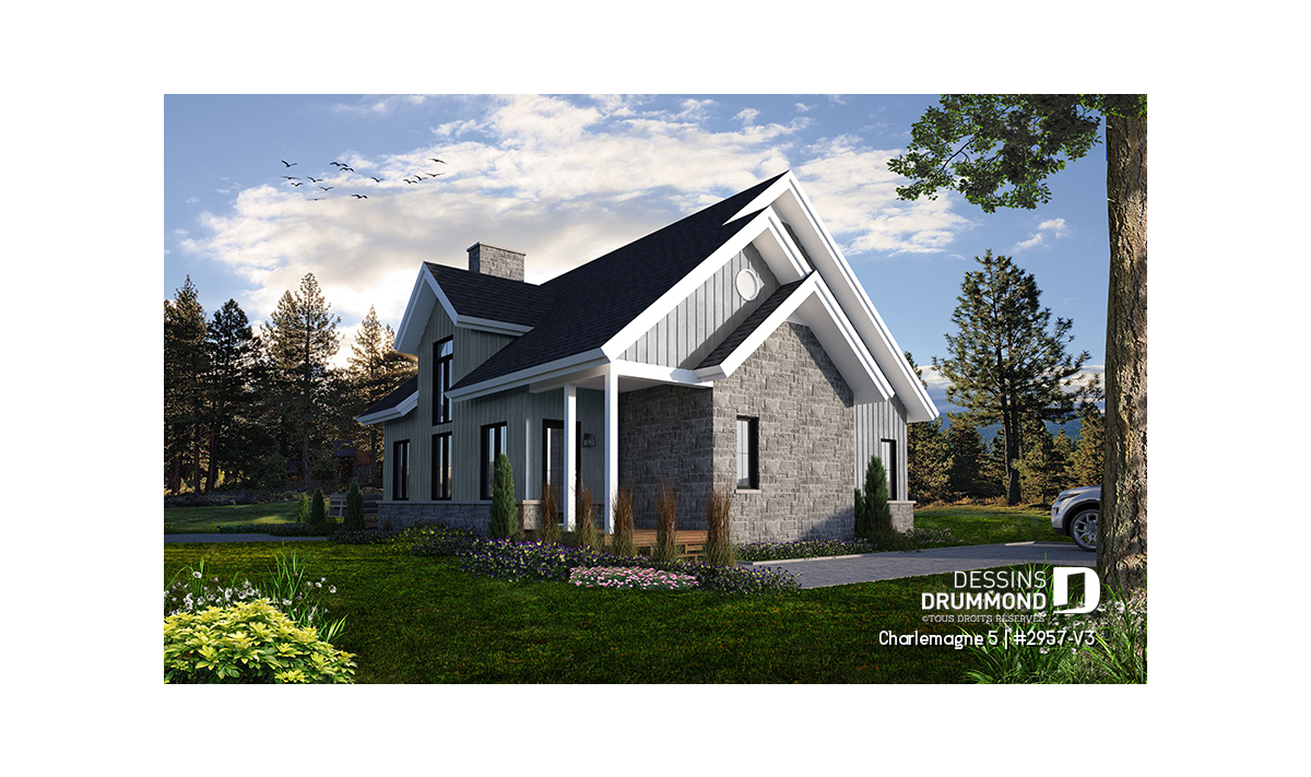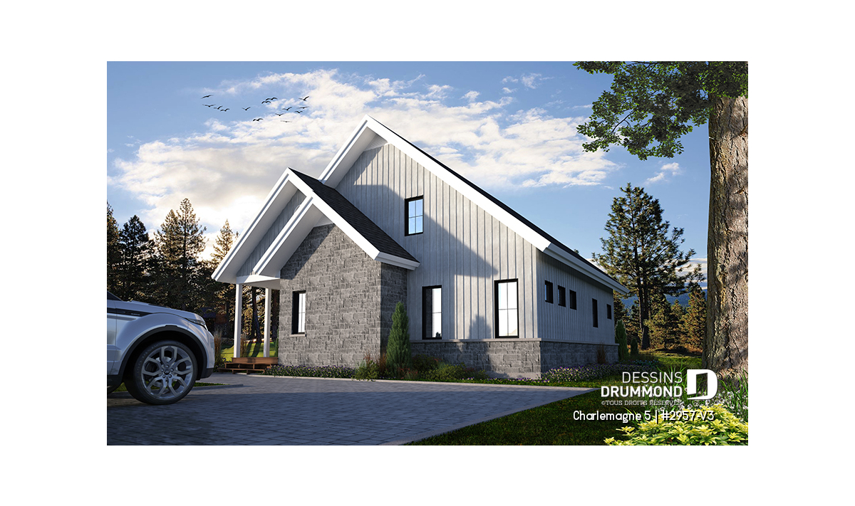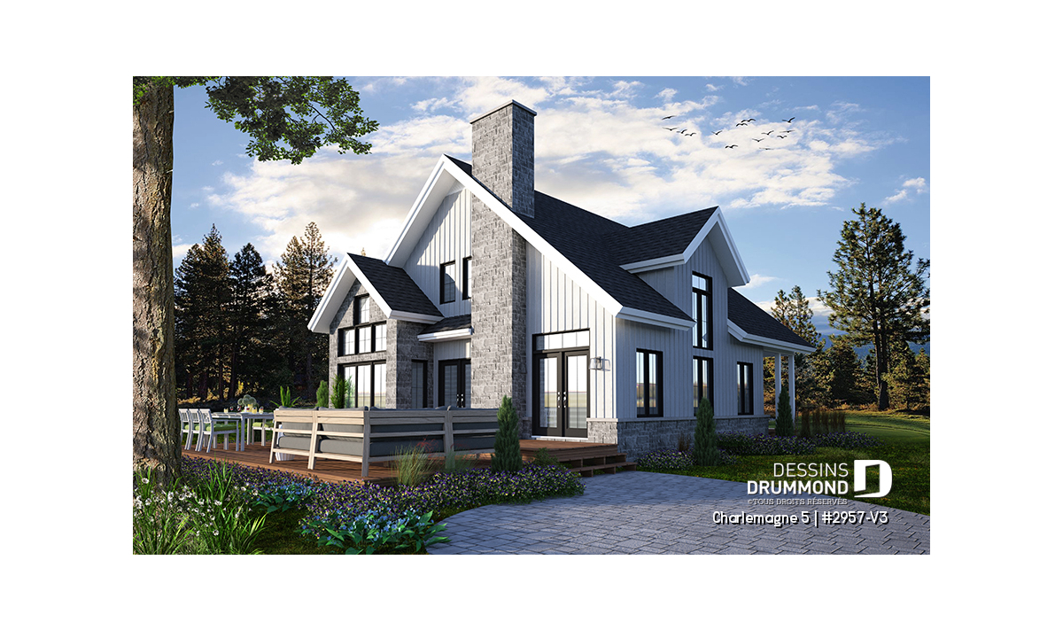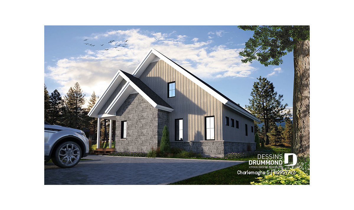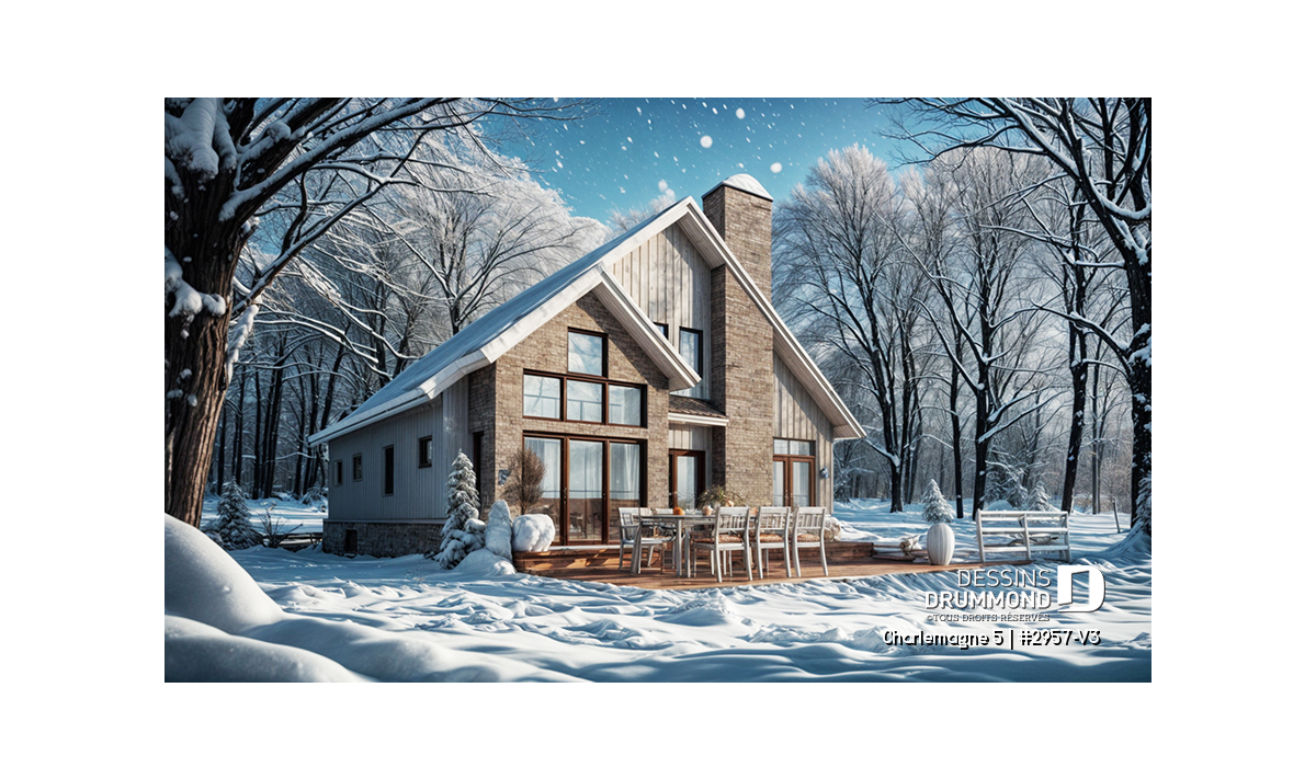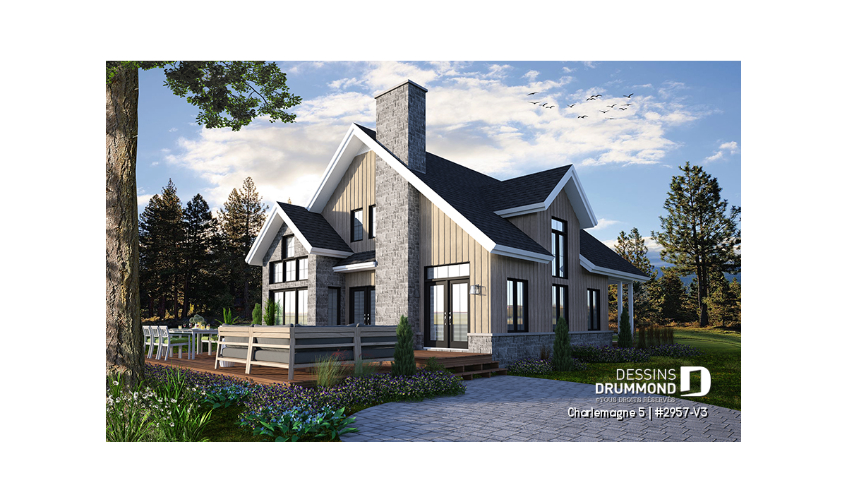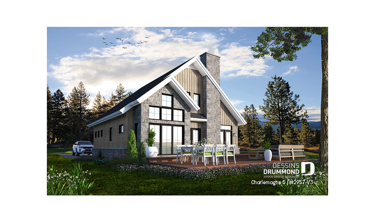 Vue arrière - MODÈLE DE BASE - Plan de maison chalet nordique – 3 chambres, mezzanine et foyer au cœur du salon - Charlemagne 5