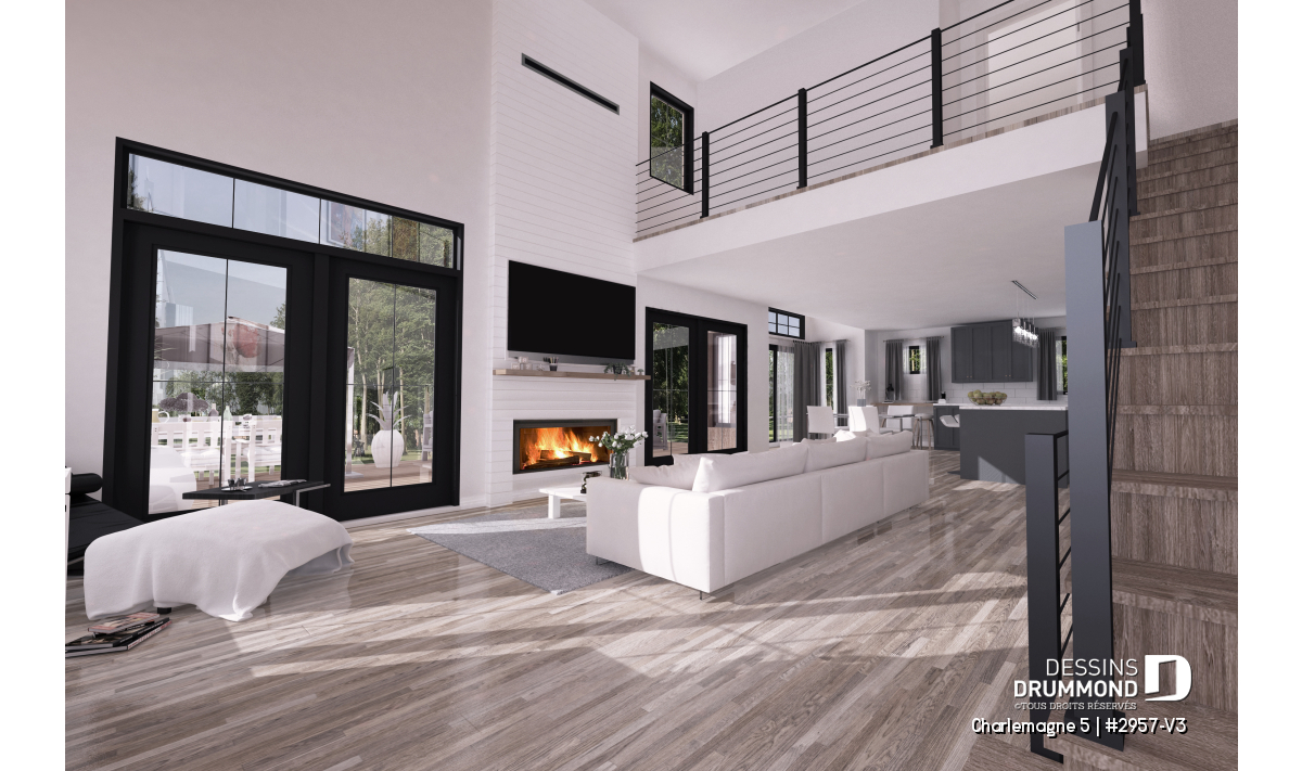 Mezzanine à l'étage et plafond cathédrale au salon pour un effet spectaculaire et lumineux.