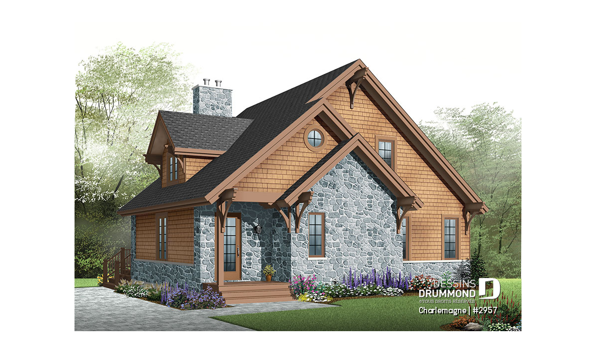 Vue avant - MODÈLE DE BASE - Modèle de chalet rustique, 3 chambres, foyer, mezzanine, aire ouverte, vestibule avec grande garde-robe - Charlemagne
