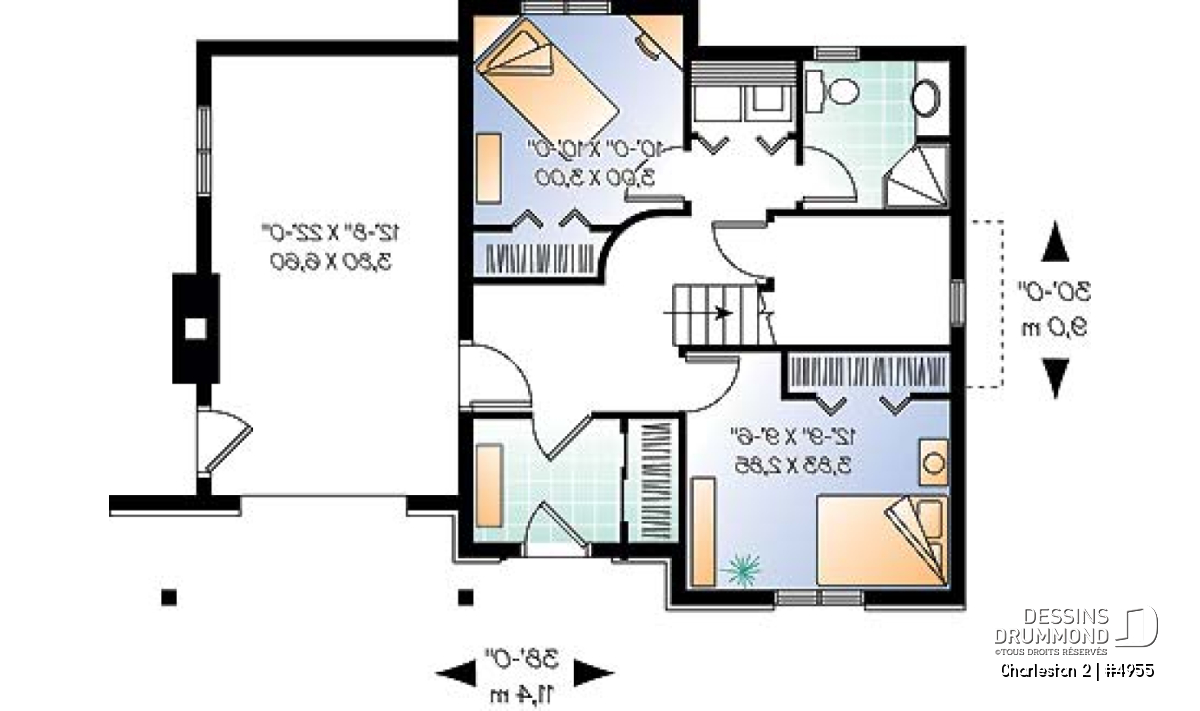 Au rez-de-chaussée, un vestibule avec grande garde-robe, deux belles chambres, un coin buanderie, une salle de douche et un grand rangement procurent à ce plancher plusieurs commodités. De plus, que dire de ce garage qu’il vous est possible de convertir en grande salle familiale; une suggestion d’ailleurs incluse au plan.