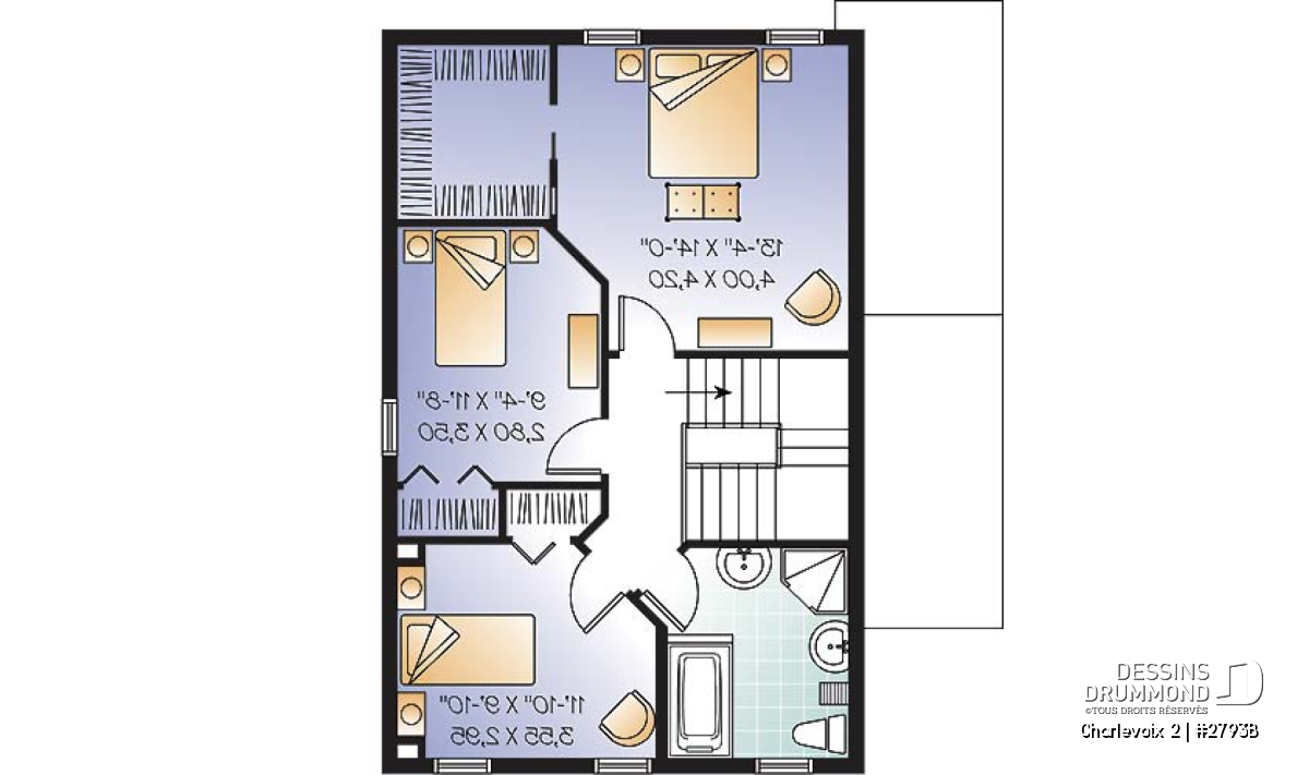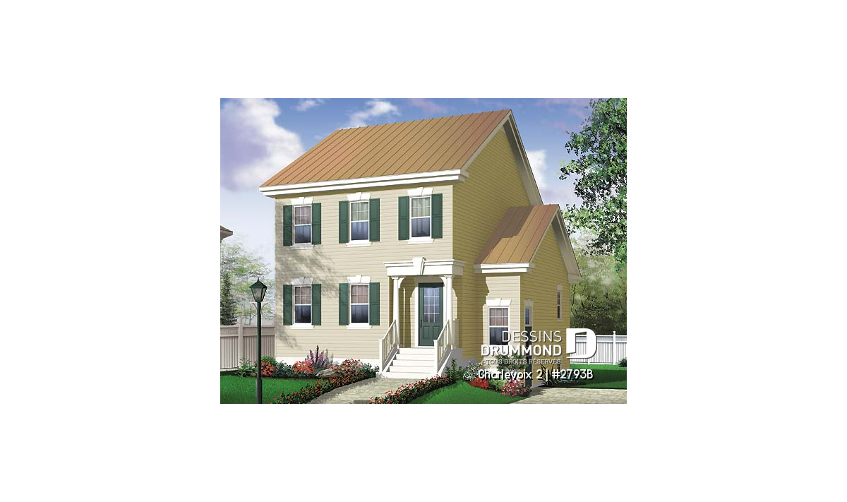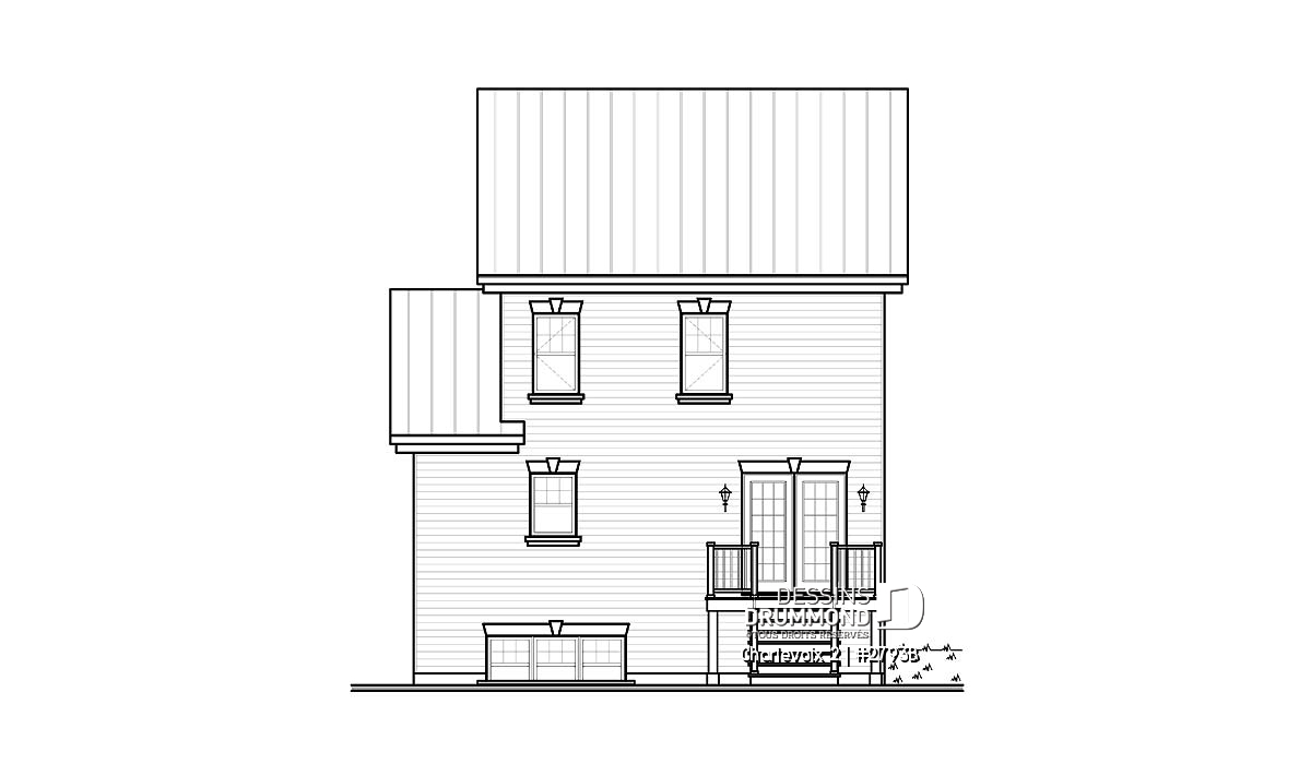 D’allure classique, ce plan propose une organisation des ouvertures typique des modèles anglais d’architecture monumentale ainsi qu’une toiture simplifiée et par le fait même facile à réaliser en tôle d’acier pré-peinte. On remarque, sur le côté gauche, une entrée de service permettant d’accéder au « bachelor » et, fait à noter, seulement six marches composent l’escalier d’accès étant donné que la maison est passablement hors terre pour bien dégager les fenêtres du sous-sol.