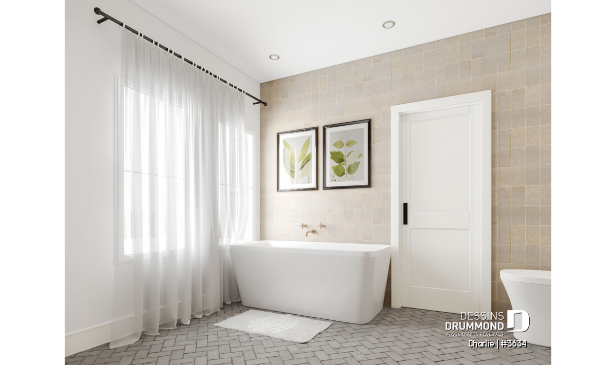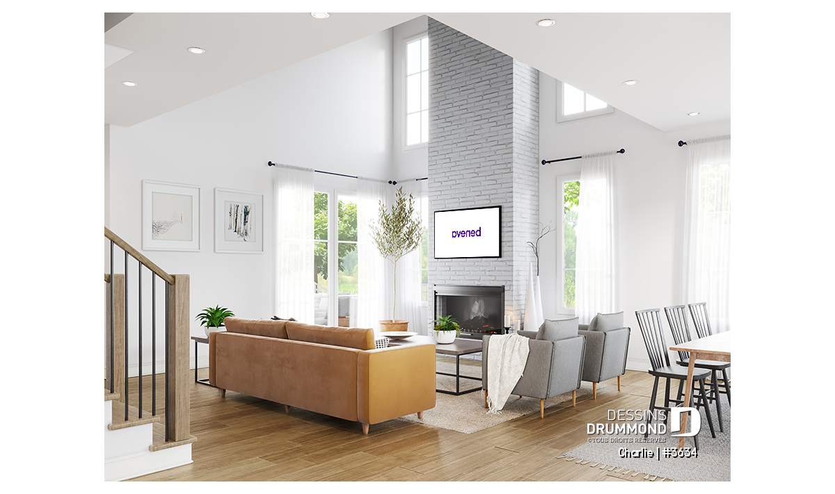 Les plafonds de 9' au rez-de-chaussée et de 18'6'' à la salle de séjour confèrent à la maison CHARLIE (#3634) une sensation d’amplitude exceptionnelle, tandis que l’abondante lumière naturelle illumine tout le secteur arrière, transformant chaque journée en un moment lumineux et inspirant.