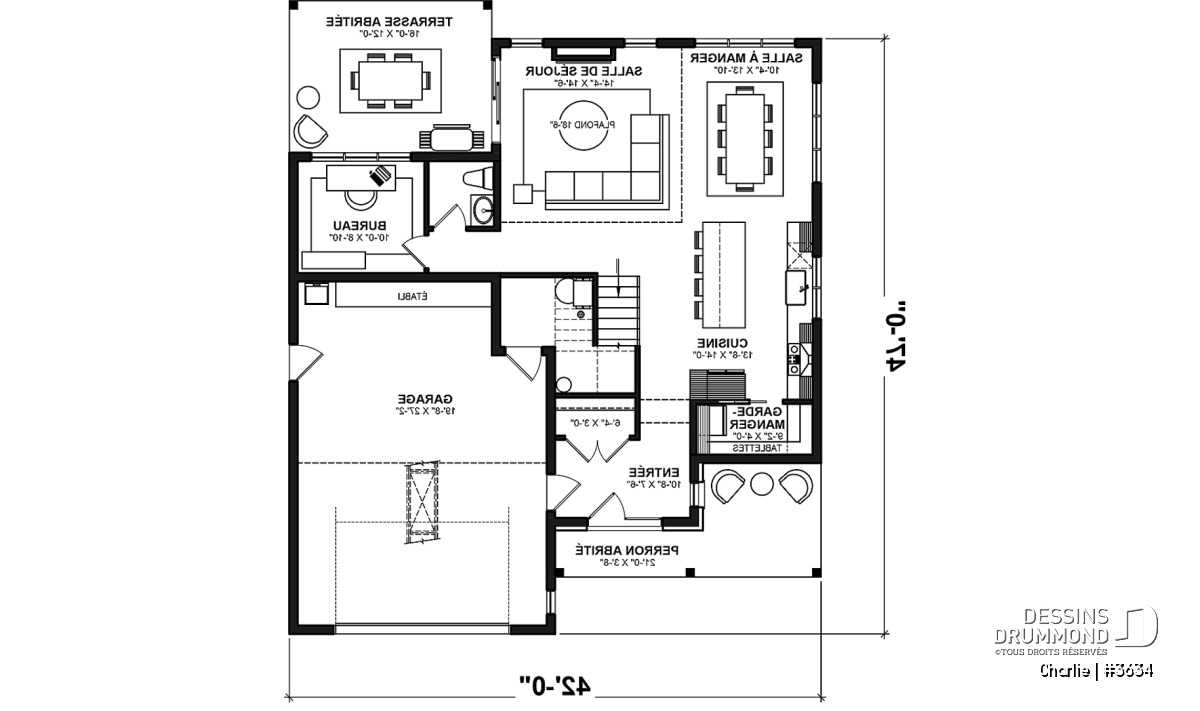 Côté pratique, la maison CHARLIE (#3634) propose un rangement supplémentaire au-dessus du garage, accessible par trappe, ainsi qu’un garage spacieux pouvant accueillir un coin atelier ou jardinage. Enfin, ce plan s’adapte à différents projets grâce à plusieurs options de fondation disponibles.