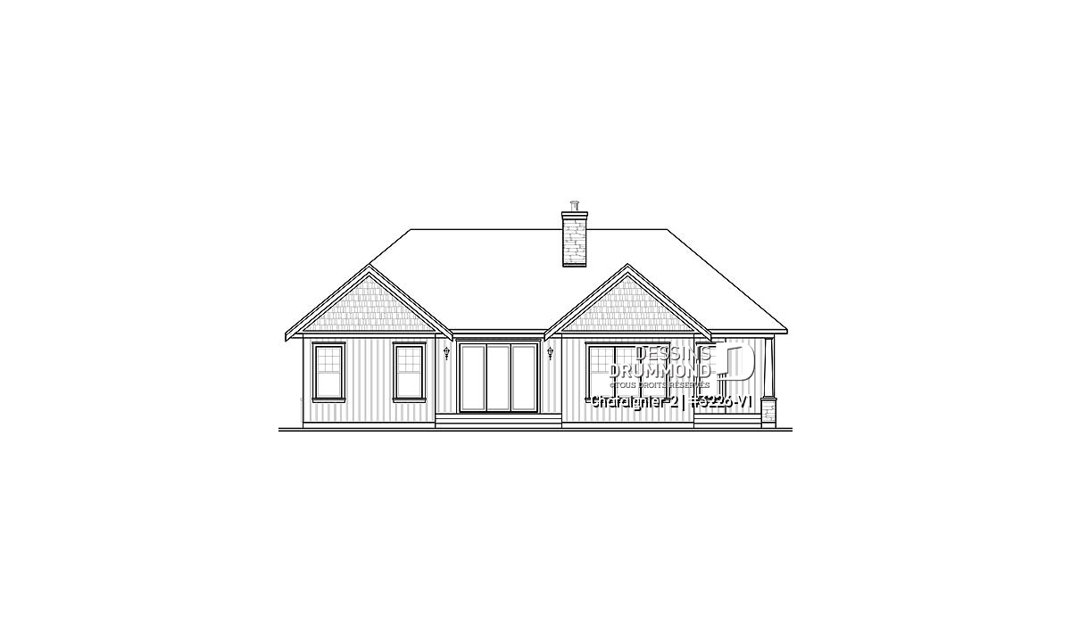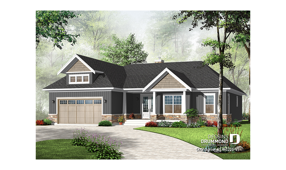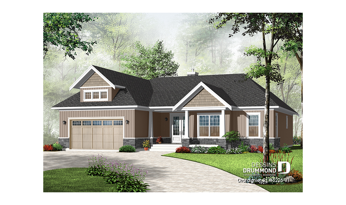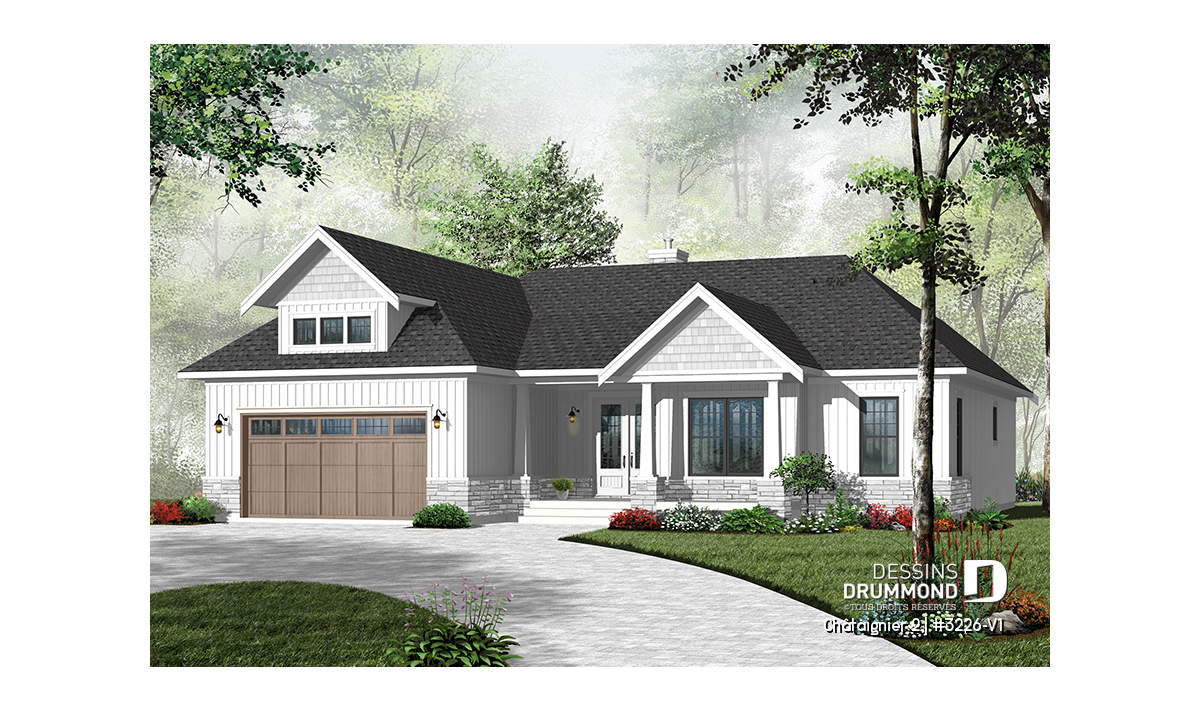 Vue avant - MODÈLE DE BASE - Plan de plain-pied style ranch, garage double, 3 chambres, 2 salles de bain, foyer, plafond 9 pieds partout - Châtaignier 2