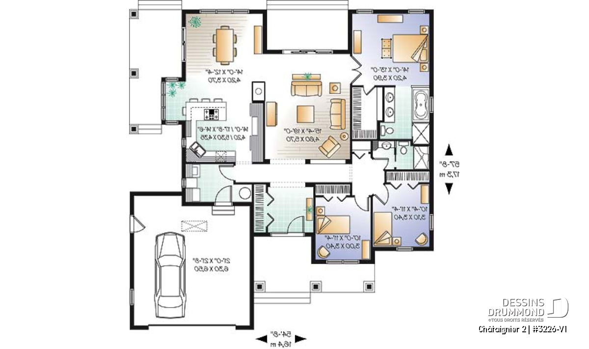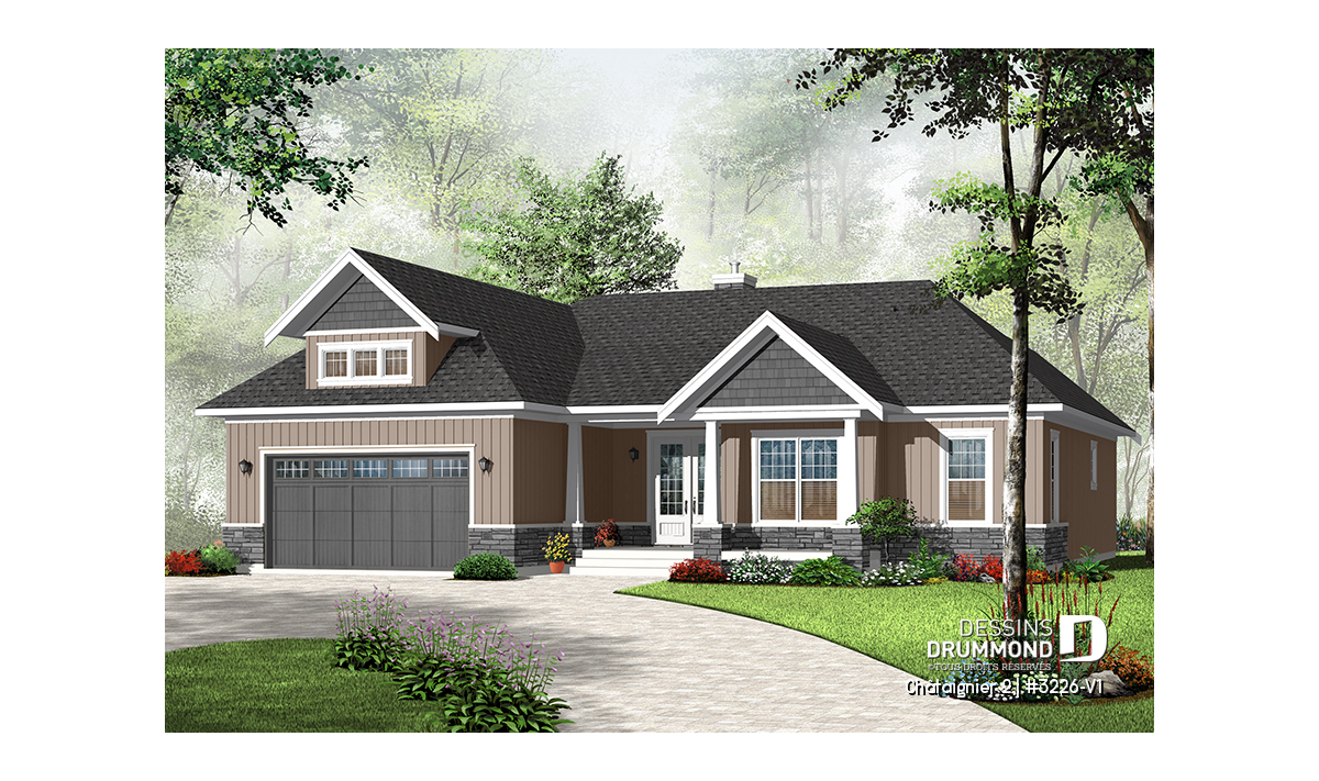 Plan de plain-pied style ranch, garage double, 3 chambres, 2 salles de bain, foyer, plafond 9 pieds partout