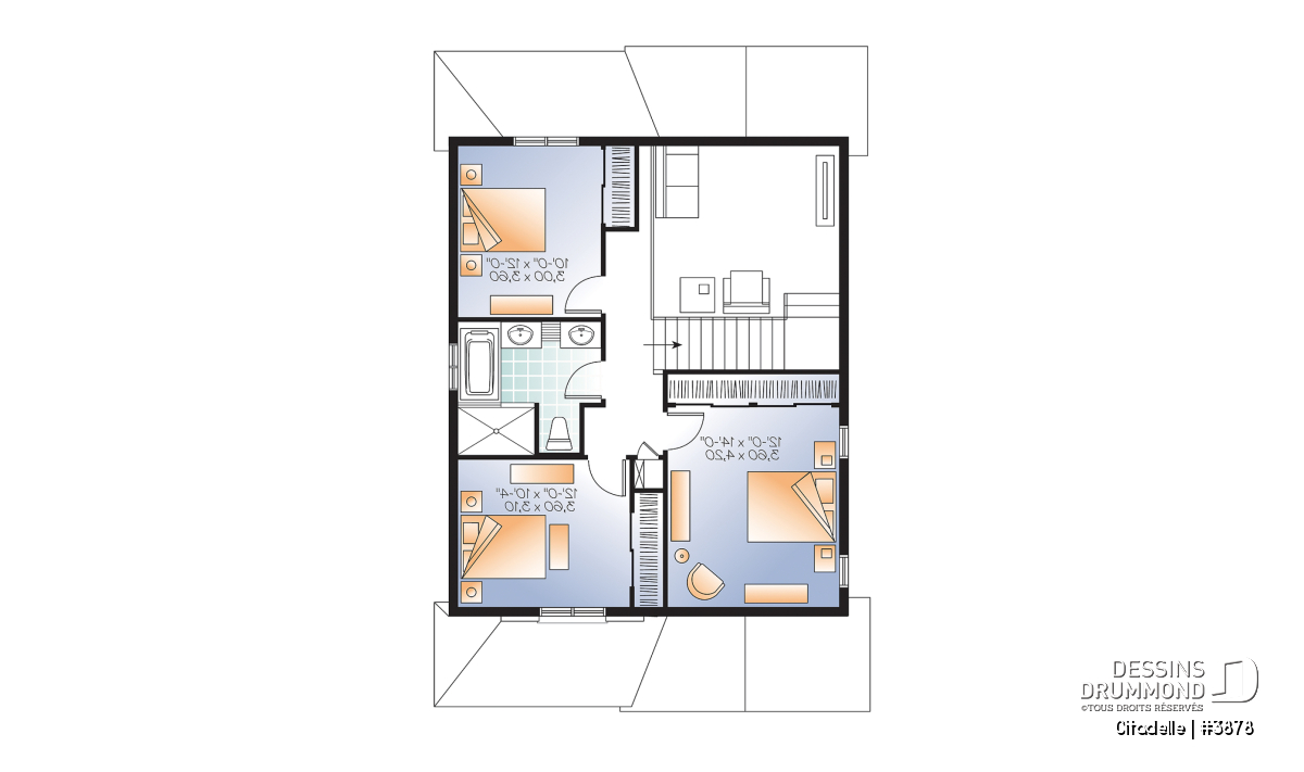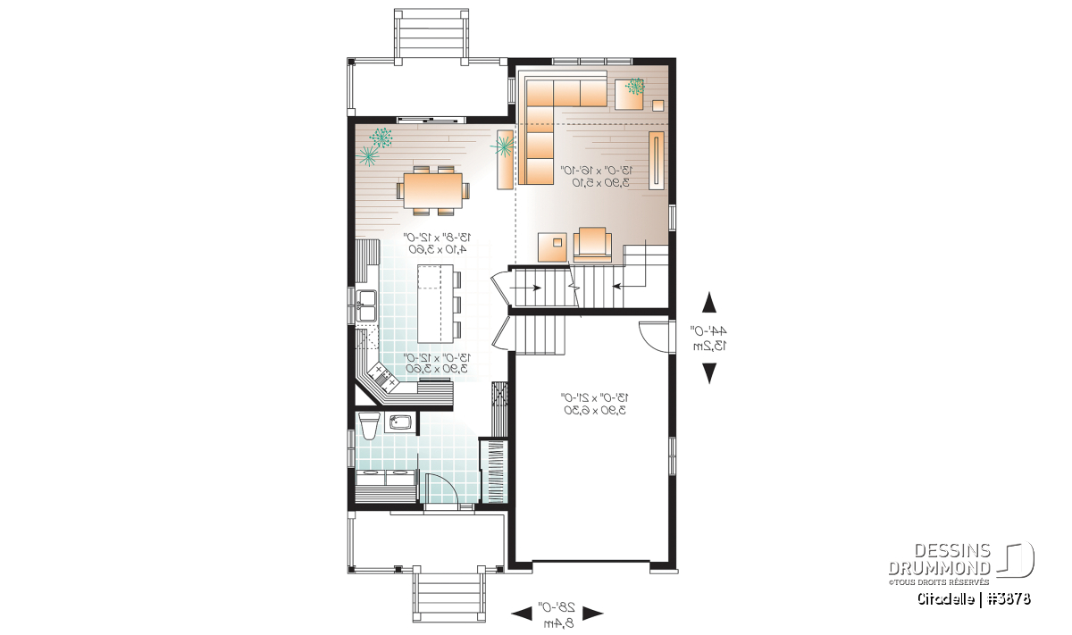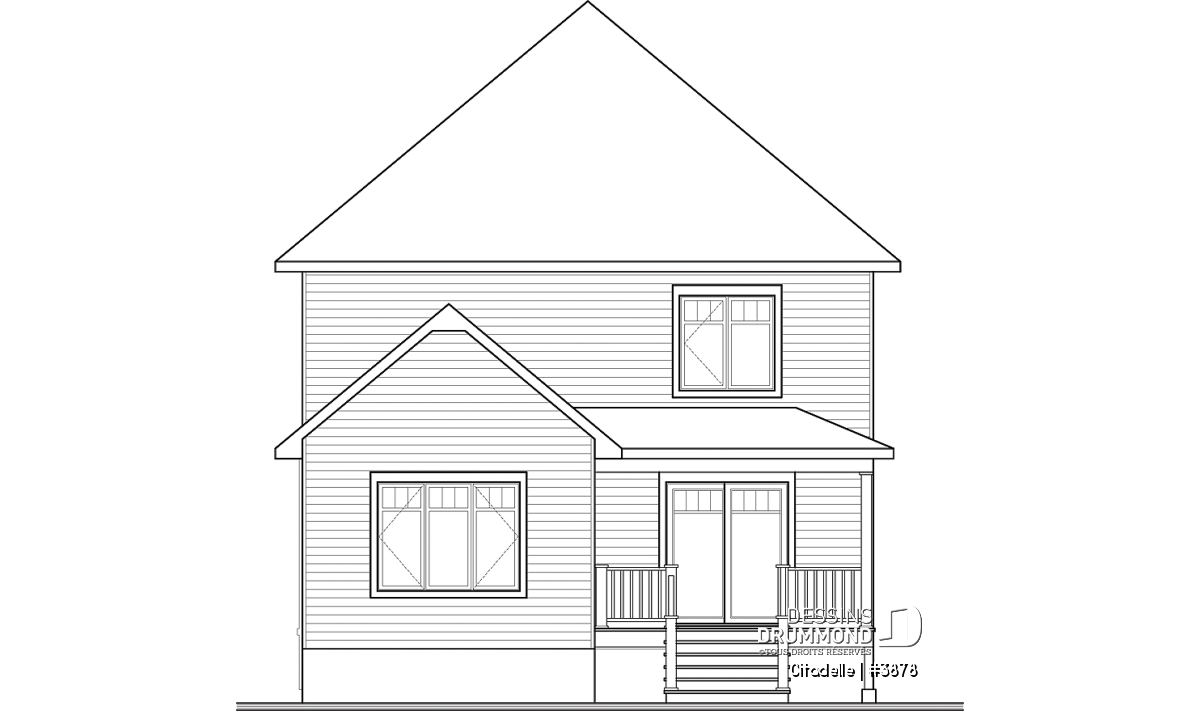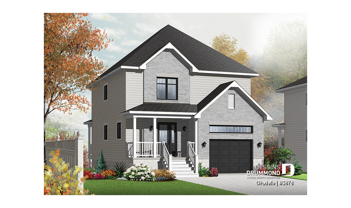 Dans la foulée de ces cottages conçus pour des terrains étroits tel que les 3876 et 3877, Dessins Drummond vous suggère ce modèle 3878 avec extérieur sobre proposant une galerie couverte à l’avant comme à l’arrière en plus d’un garage faisant 13pi x 21pi fini intérieur. Entrons donc sans plus tarder pour apprécier davantage ce plan de maison à étage.