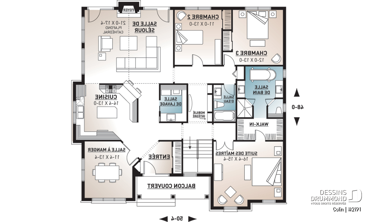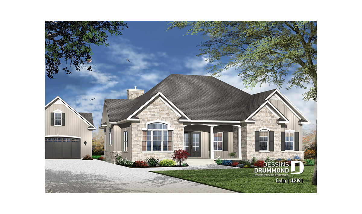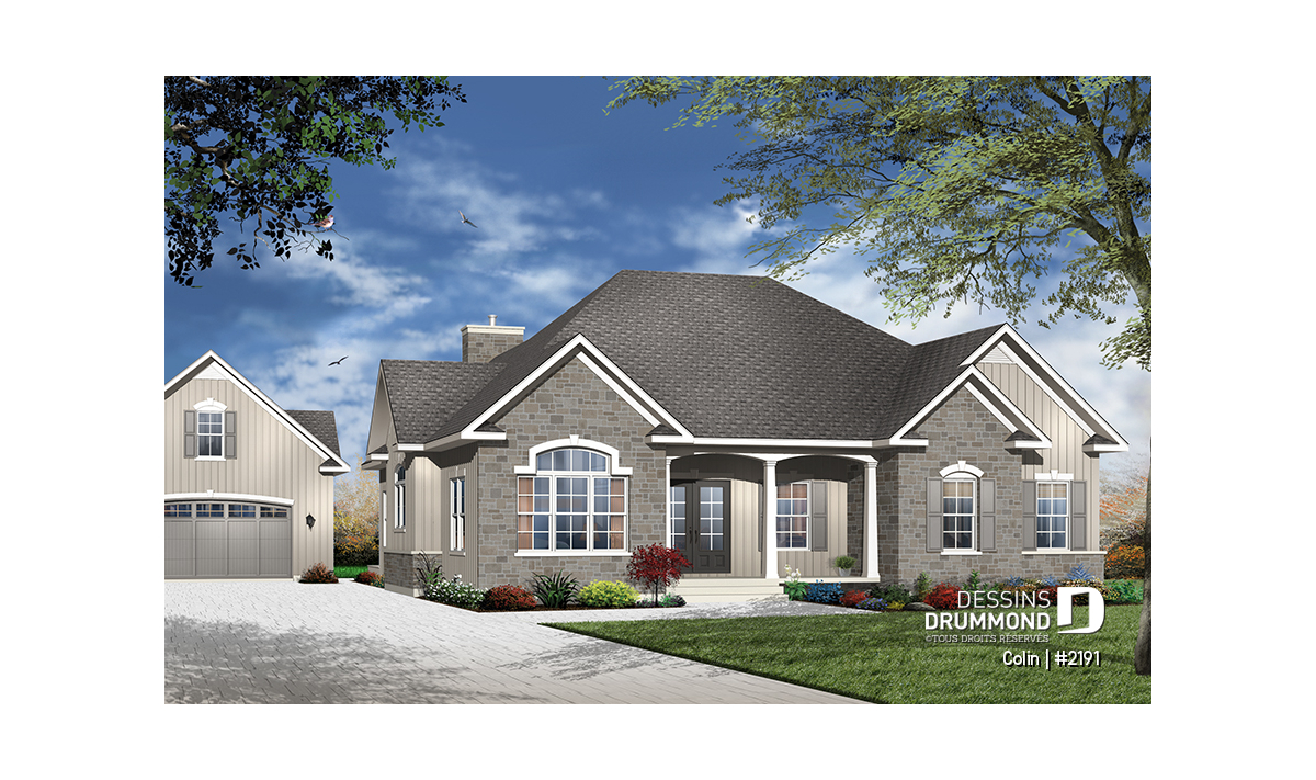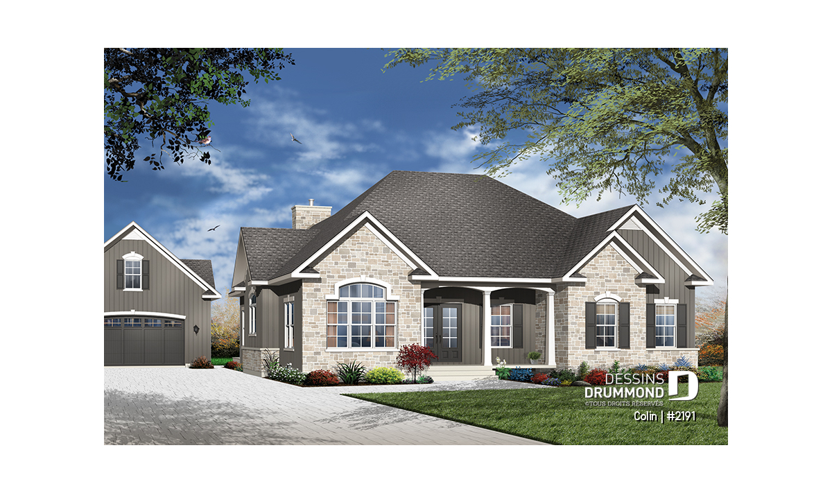 Agrémenté de volumes et pignons extérieurs lui permettant de mieux compenser son importante emprise au sol, ce plain-pied de grande surface propose un intérieur remarquable et tout en confort. D’ailleurs, avec des plafonds à neuf pieds partout, il offre suffisamment de hauteur pour les grands espaces intérieurs qu’il suggère. Entrons donc !
