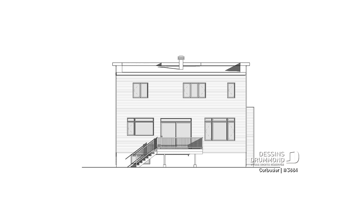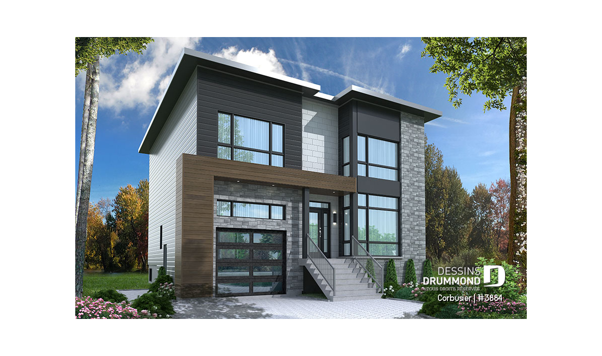 D'emblée vous serez charmés par la quantité de fenêtres en façade, laissant passer la lumière naturelle dans les pièces stratégiques. Ce nouveau plan de maison contemporaine Dessins Drummond - plan no. 3884 - vous parlera avec son look moderne proposant du bois en façade, amenant ainsi une touche rustique à son enveloppe qui offre près de 2500 pi.carré de surface aménagée! De quoi satisfaire les famille nombreuses et les familles reconstituées!