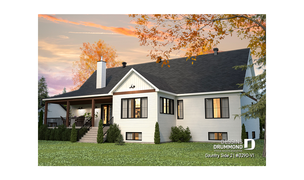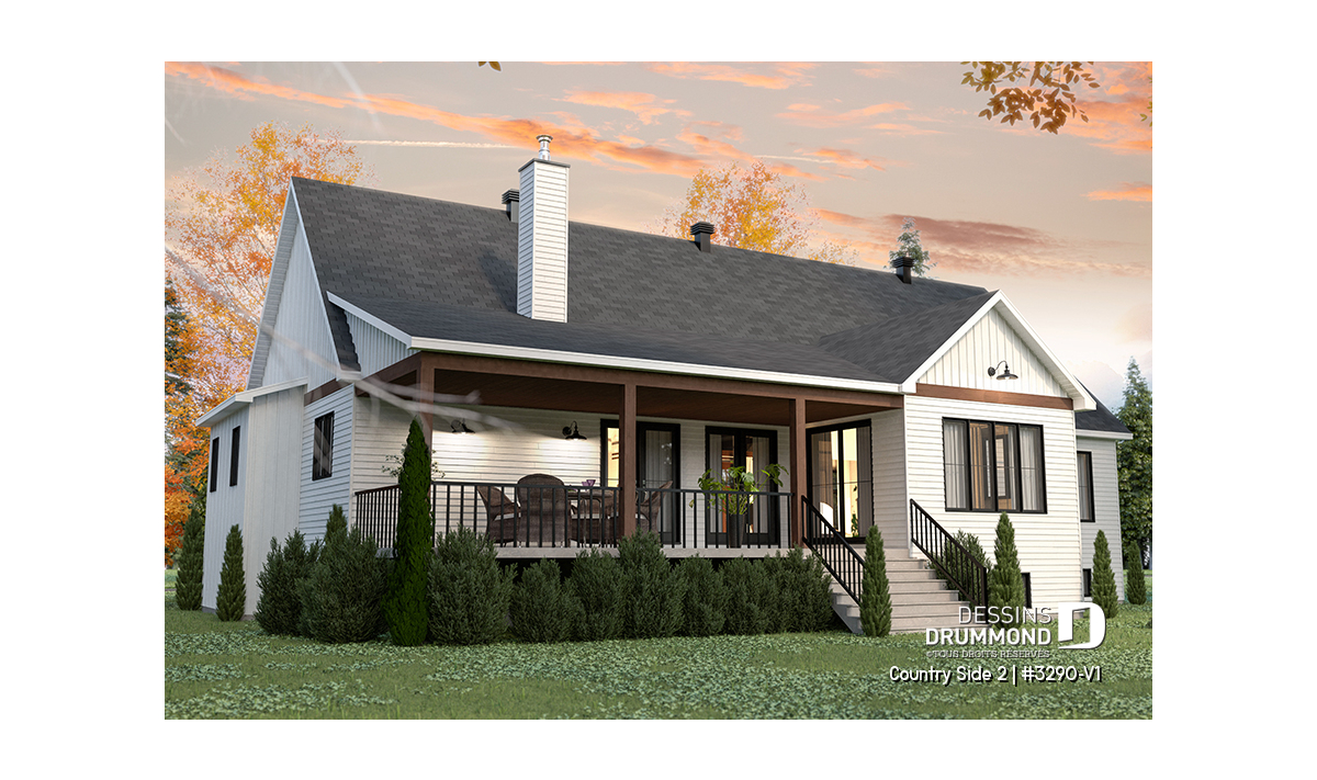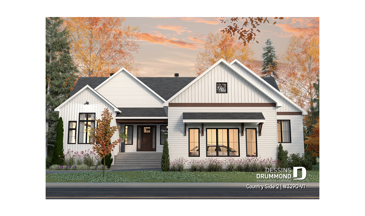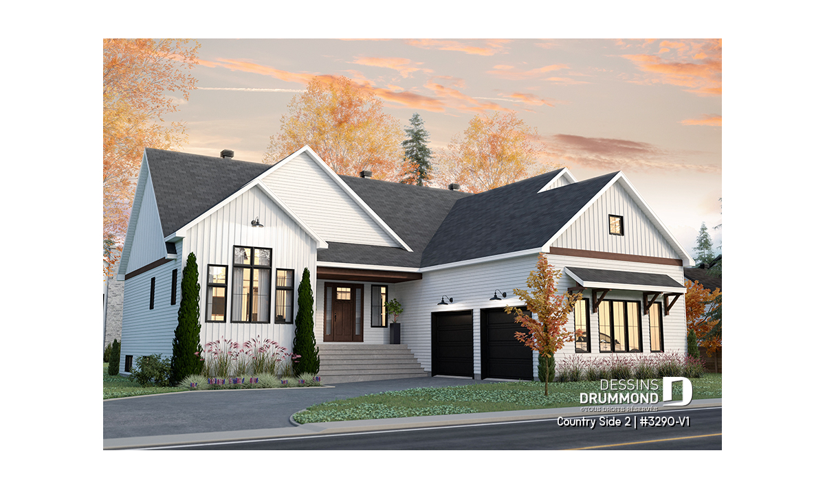 Le superbe plan de maison de type plain-pied COUNTRY SIDE 2 (#3290-V1) et de style Farmhouse Moderne (très populaire style!!) est une version agrandie et modifiée de son plan d’origine, Country Side (#3290). Dans cette nouvelle version, la superficie a été agrandie d’un peu plus de 200 pi.ca. au rez-de-chaussée, le garage double a été relocalisé (et devenu avec entrée latérale) et la terrasse abritée à l’arrière est beaucoup plus spacieuse.