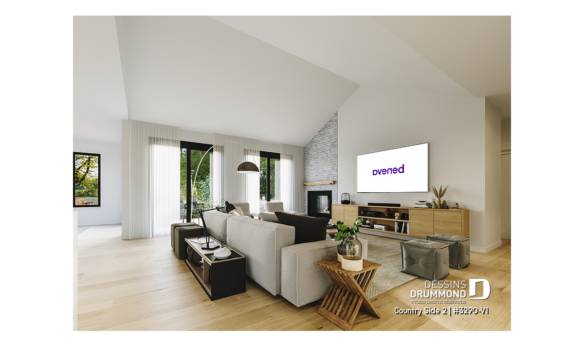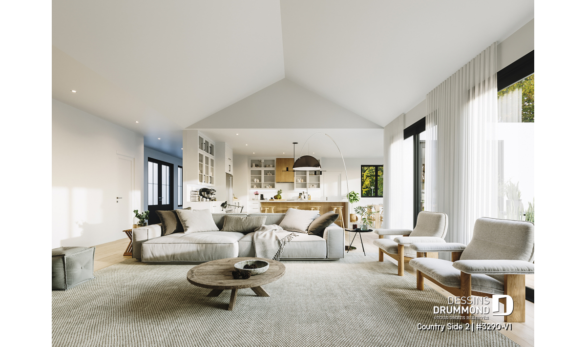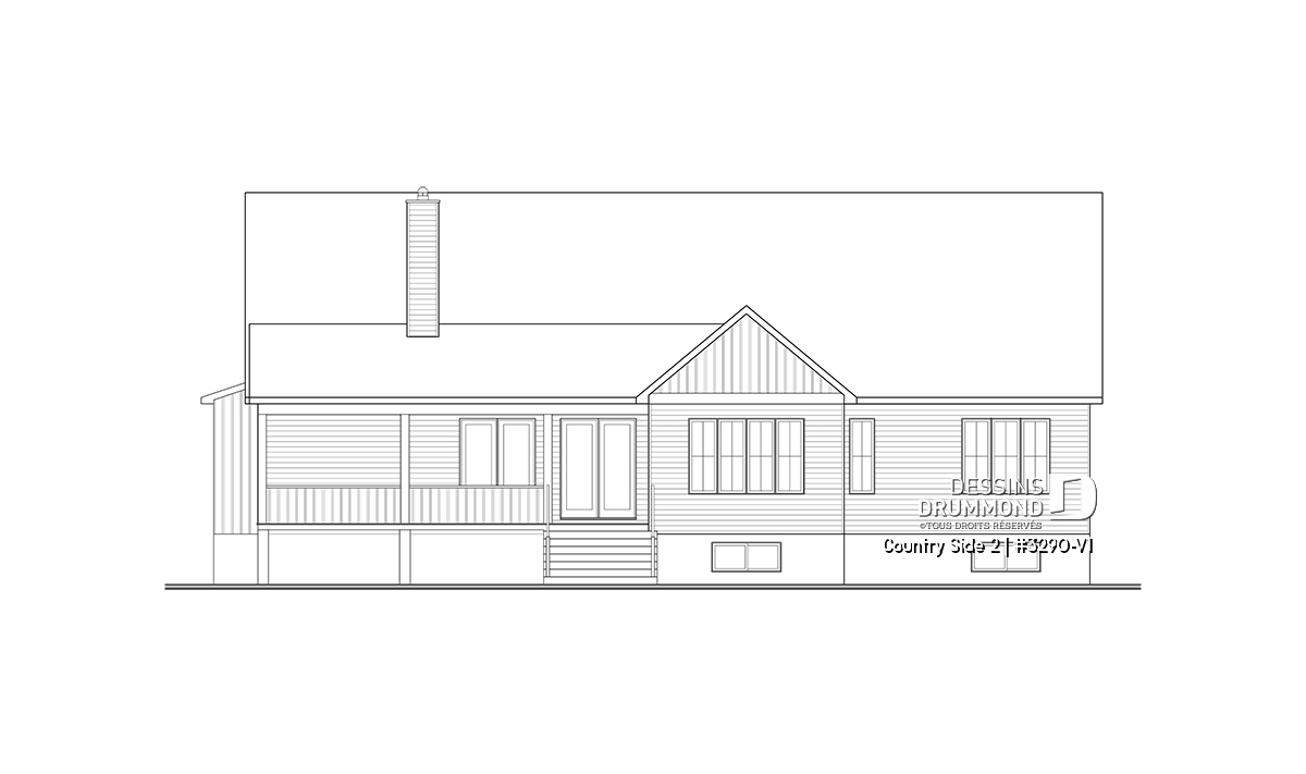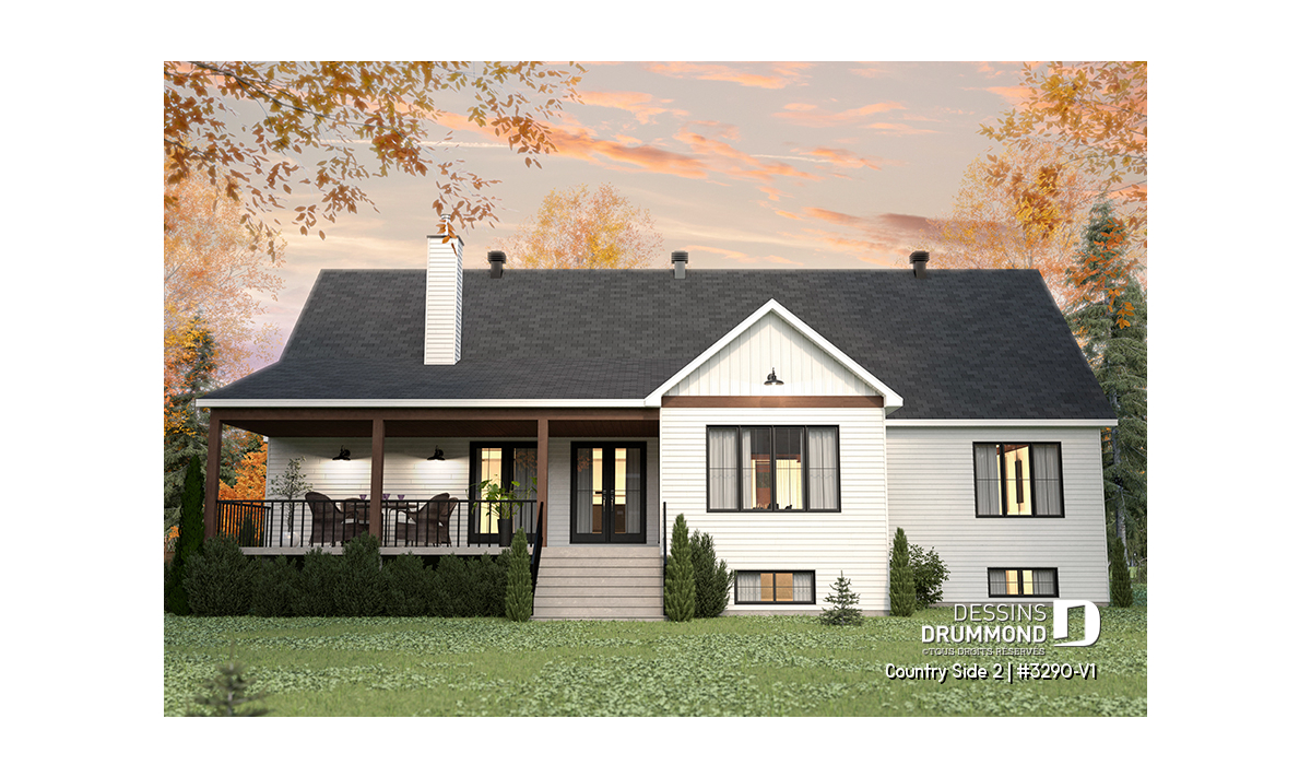 Le superbe plan de maison de type plain-pied COUNTRY SIDE 2 (#3290-V1) et de style Farmhouse Moderne (très populaire style!!) est une version agrandie et modifiée de son plan d’origine, Country Side (#3290). Dans cette nouvelle version, la superficie a été agrandie d’un peu plus de 200 pi.ca. au rez-de-chaussée, le garage double a été relocalisé (et devenu avec entrée latérale) et la terrasse abritée à l’arrière est beaucoup plus spacieuse.