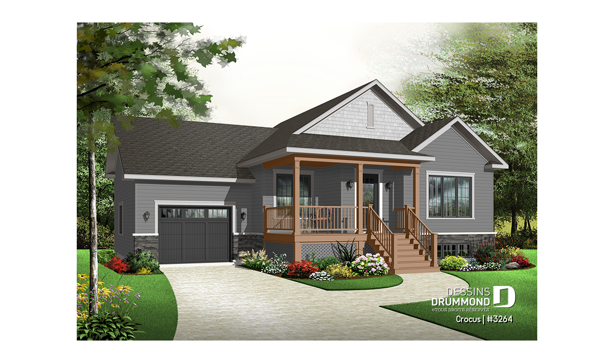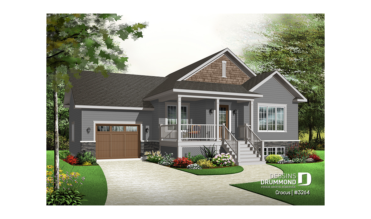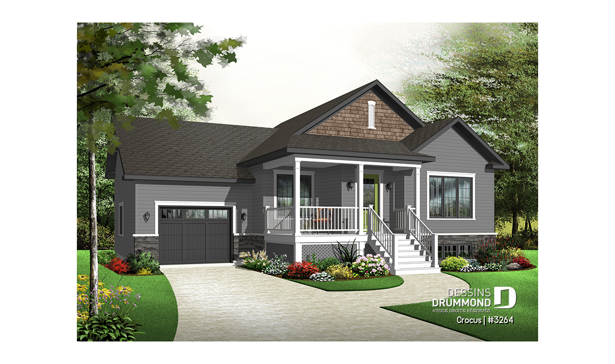 Plan de maison Craftsman, grande galerie, vestibule, 2 chambres, garage accès au s-s