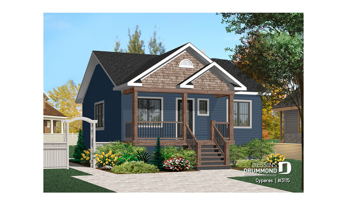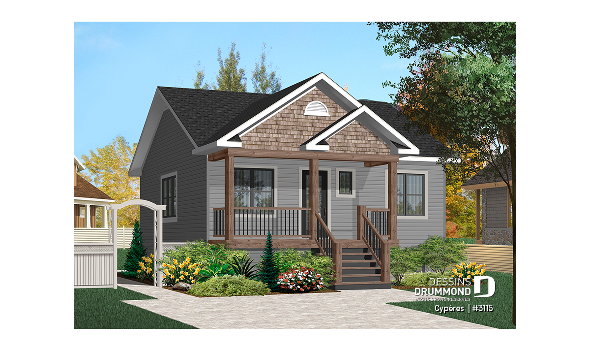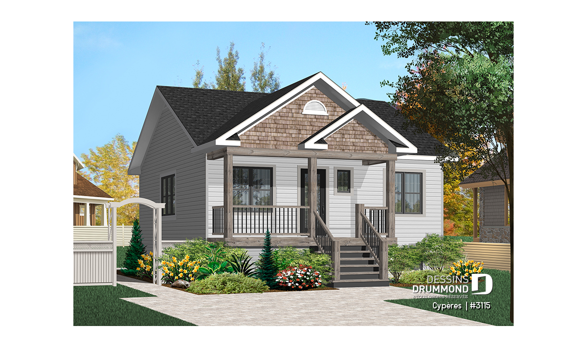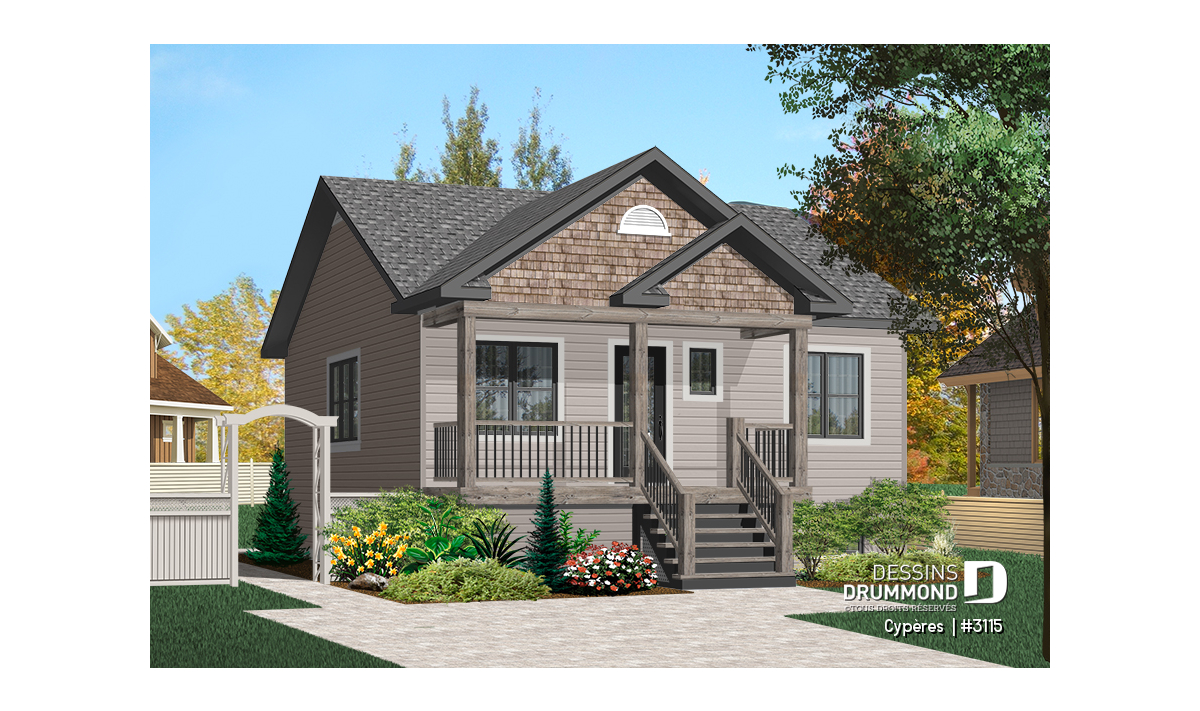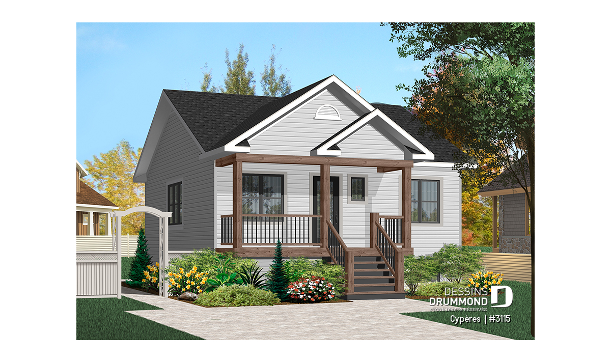 Vue avant - MODÈLE DE BASE - Plan de maison plain-pied petit budget 2 chambres, cuisine avec îlot, aire ouverte, parfaite première maison - Cypères