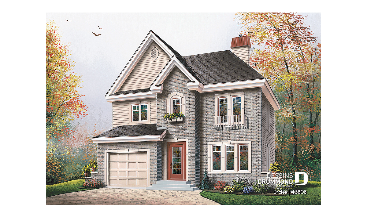 Vue avant - MODÈLE DE BASE - Plan de maison à étage, chambre des maîtres avec grand walk-in, portes françaises au séjour, 3 chambres - Drake