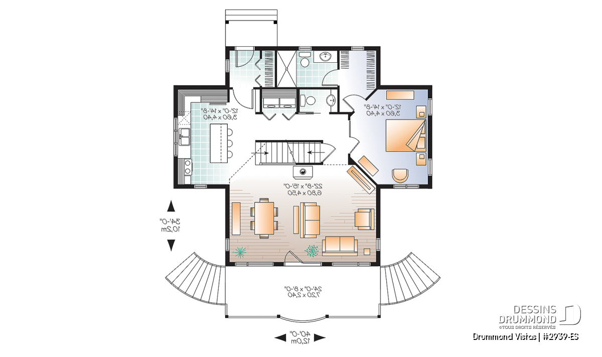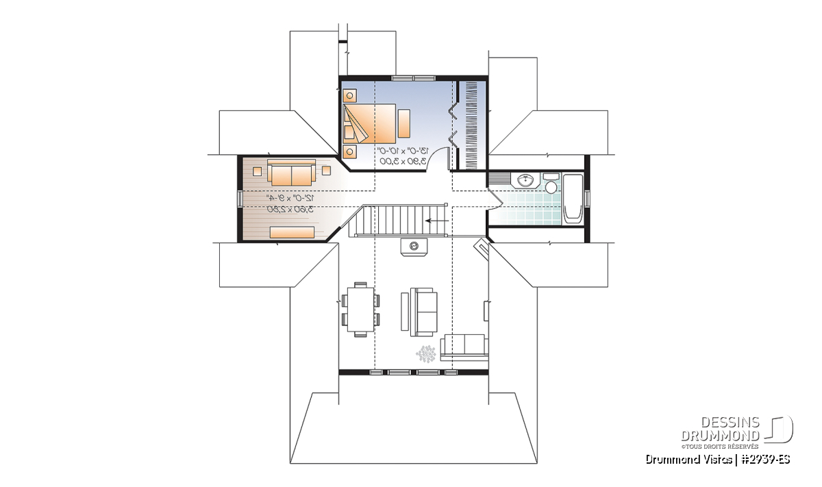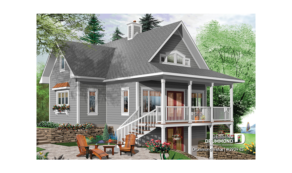 Dans le but de vous permettre de bien vieillir avec votre chalet, ce plan 2939-ES (Drummond Vistas) est conçu afin que vous viviez au quotidien sur un même plancher. Ainsi, au rez-de-chaussée, appréciez un vestibule à l’entrée avant, une cuisine avec îlot, une salle à manger jumelée à une salle de séjour avec plafond cathédrale et espace pour un poêle ou foyer. Sans oublier une suite des maîtres avec salle de douche privée et un coin laveuse-sécheuse tout près. Une petite salle d'eau complète, pratique pour les invités, complète à merveille ce plancher.