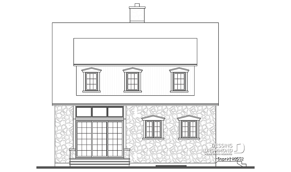 Vue avant - MODÈLE DE BASE - Maison ancestrale en pierre, salle à diner en solarium, 2 chambres à l'étage, foyer, espace ouvert - Dupré