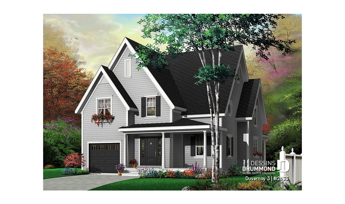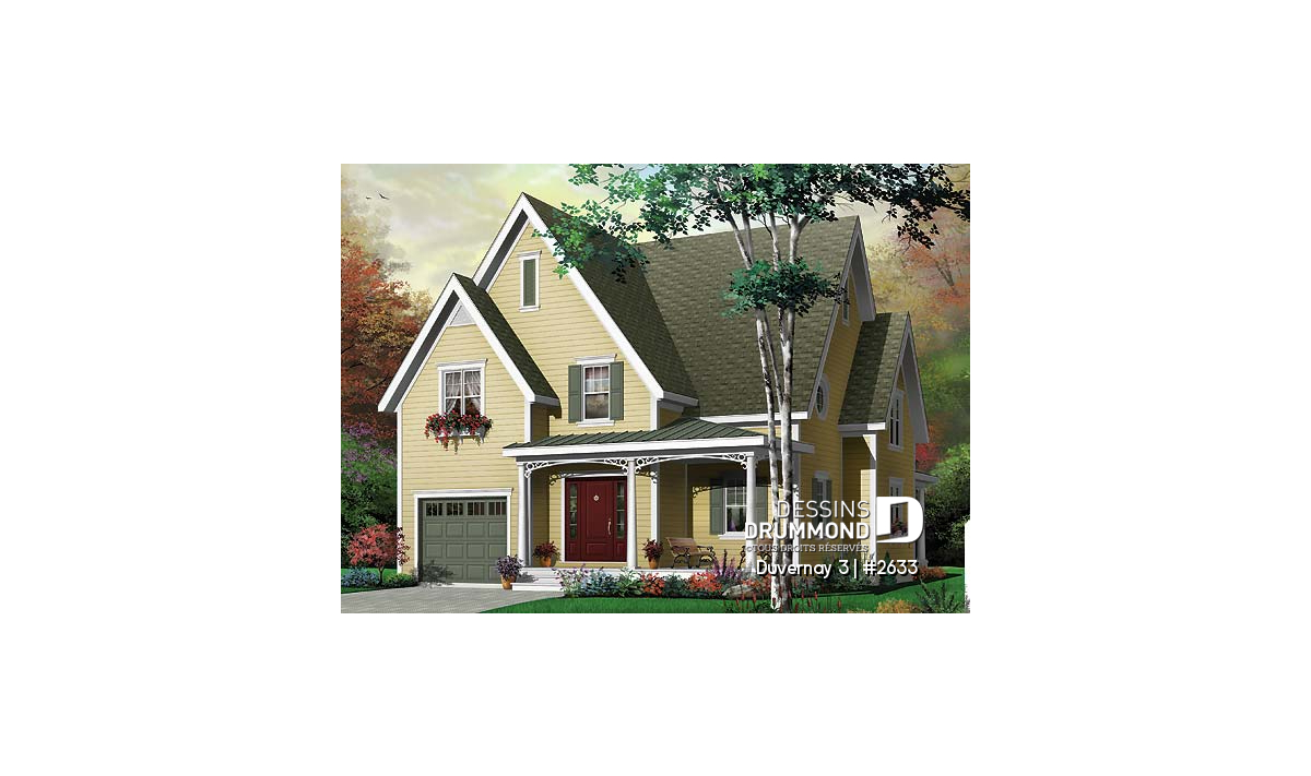 D’abord, un garage bien intégré et une entrée avant couverte. Ensuite, un vestibule, un espace bureau à domicile et plus particulièrement tout ce secteur activité situé à l’arrière, amplement fenestré et regroupant une cuisine attrayante avec ilôt central et une salle à manger groupée à une salle familiale agrémentée d’un foyer.