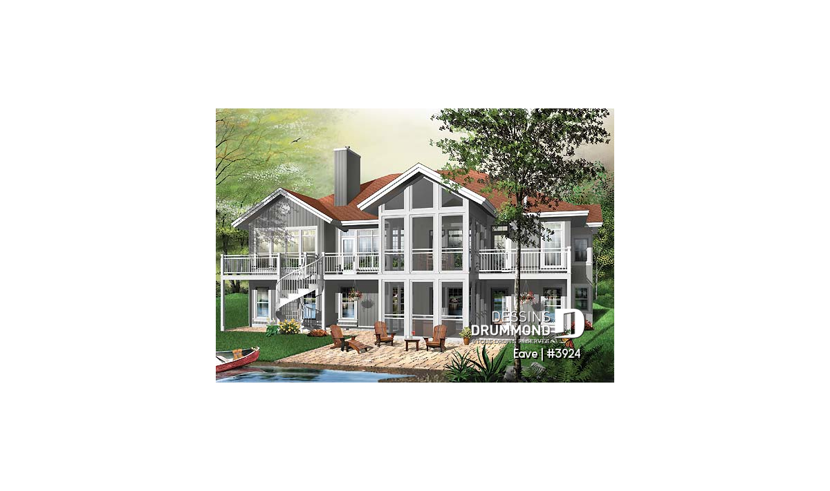 Vue arrière - MODÈLE DE BASE - Plan de chalet avec bachelor au sous-sol (invités ou location) total 5 chambres 4 s.bain, 3 foyers - Eave