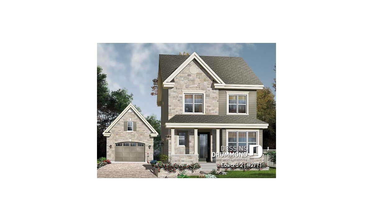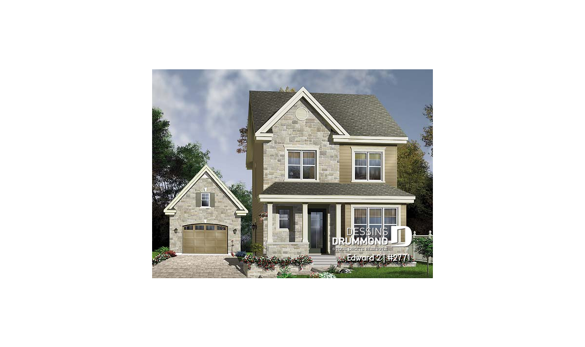 La présence d’un garage détaché suggérant un attique ou grenier logeable et que vous pouvez vous procurer pour seulement 49$ ( taxes en sus ), à l’achat d’un plan budget de cette maison, permet l’obtention de plus de lumière dans la maison ( aucun mur n’étant mitoyen avec le garage ) tout en proposant un cachet d’ensemble fort réussi.