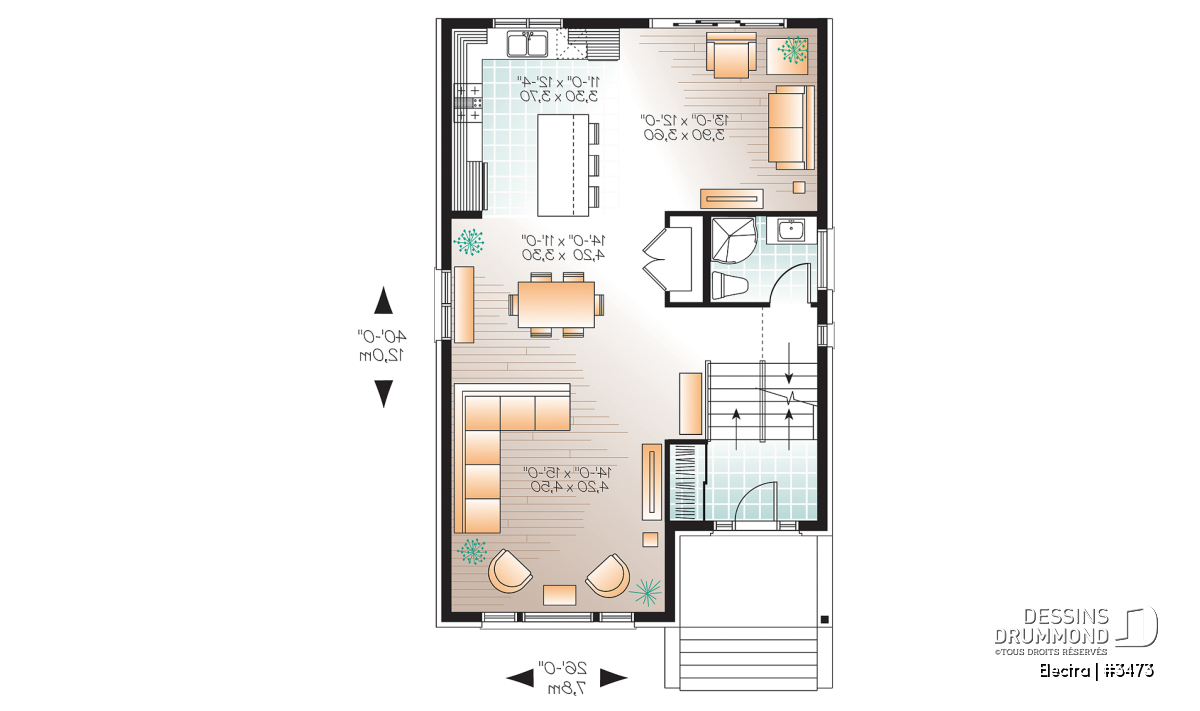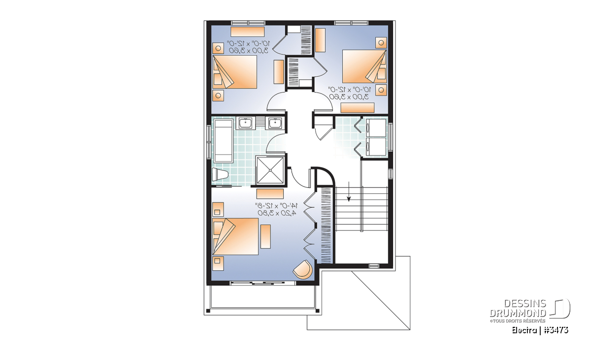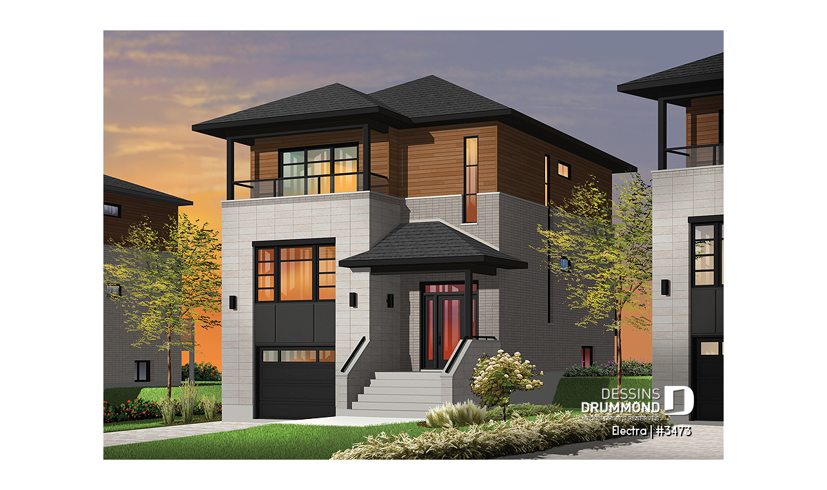 Réalisée à partir du plan original 2453, ce plan 3473 se veut une solution fort attrayante pour tous ceux à la recherche d’un plan contemporain avec garage qu’ils désirent ériger sur un terrain étroit comme on en retrouve si souvent en milieu davantage urbain.