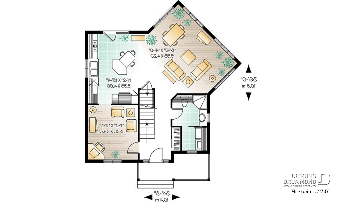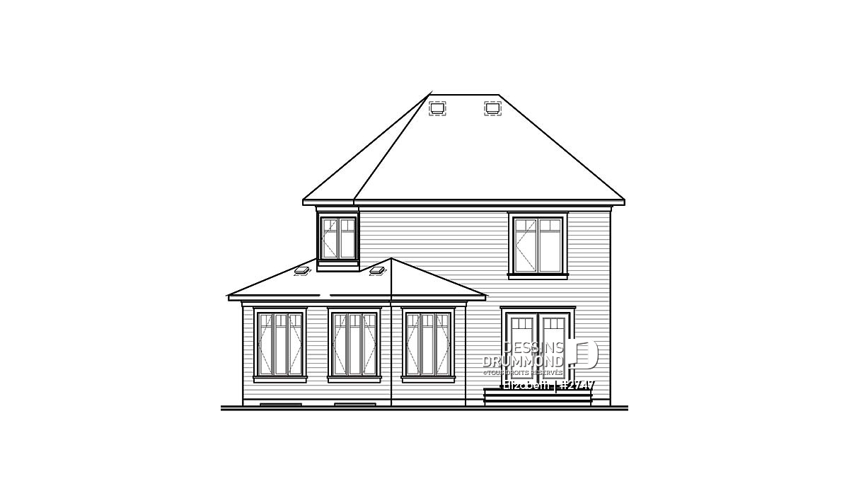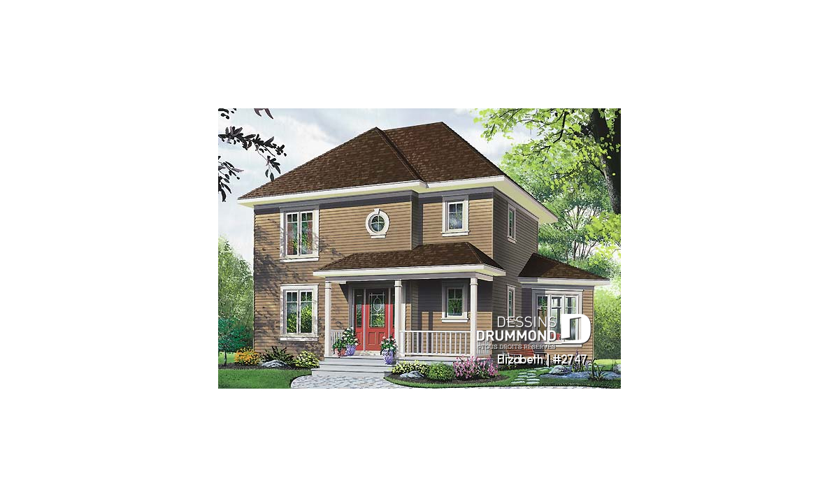 D’abord champêtre avec ses matériaux de recouvrement et sa galerie avant couverte, ce modèle bénéficie aussi d’une touche contemporaine avec ses lignes de toiture aux corniches toutes horizontales et son volume à angle situé au coin gauche-arrière et entièrement fenêtré.
