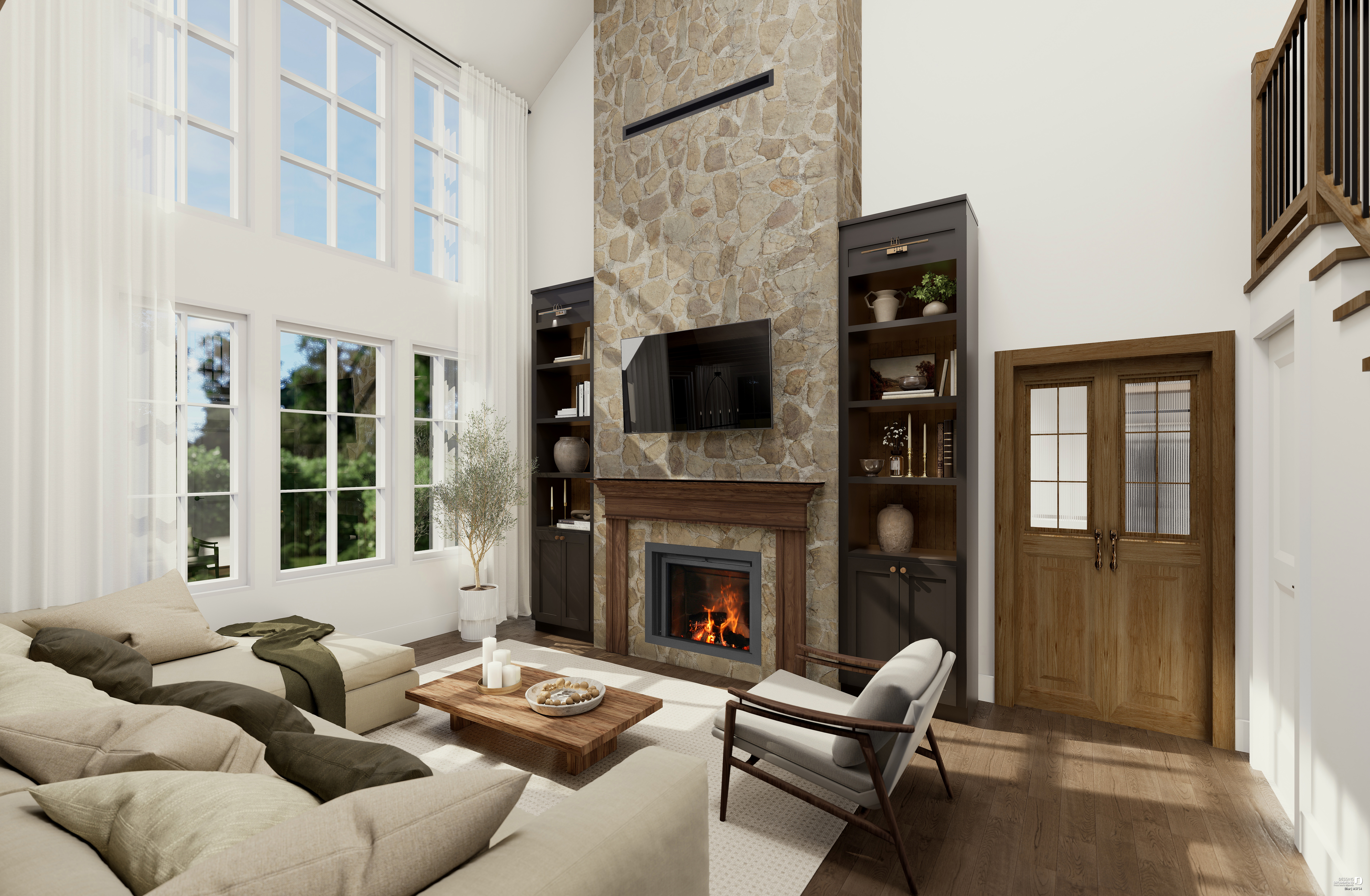 Cependant, si des poutres ou moulures de bois ou imitation de bois sont installées dans un plafond cathédral (sur nos illustrations ou photos), elles ne sont pas incluses dans les estimations. À noter que les poutres de bois illustrées sur l'extérieure de nos maisons sont incluses dans le coût, mais elles sont «capées » et non en bois massif.